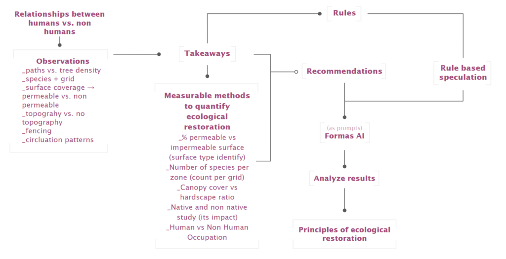 Through rule-based speculation, the project tests how restructuring circulation, redefining soil conditions, adjusting ground demarcation, and diversifying species distribution could shift the park from diffuse human dominance toward more stable ecological habitats.
