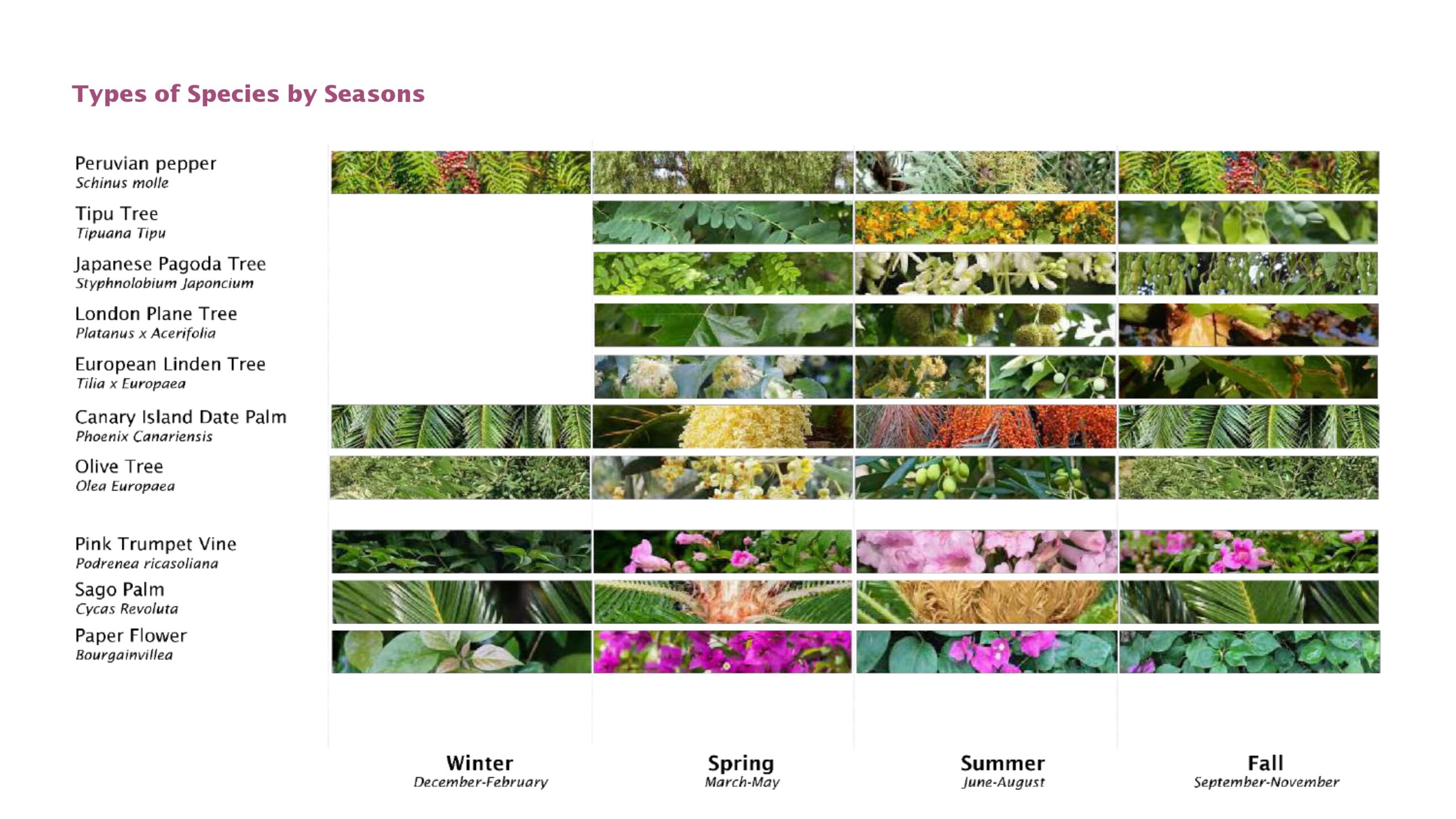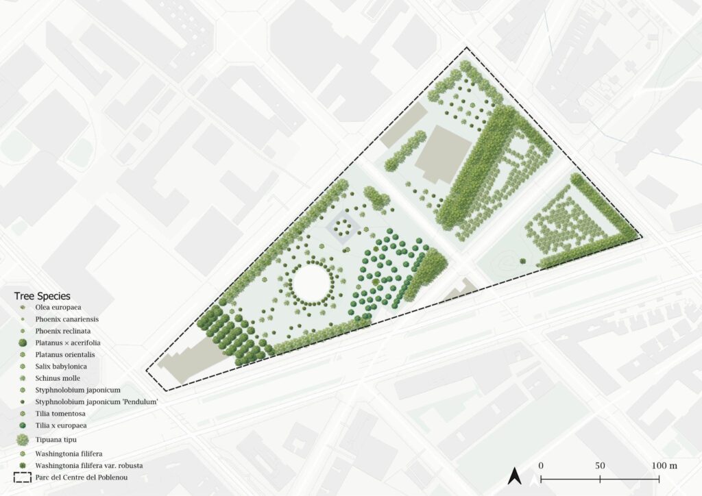 The vegetation in Parc del Centre del Poblenou is a lively mix of species chosen for their adaptability to Barcelona’s Mediterranean climate and urban conditions. While not all are strictly native, many — such as the London plane tree (Platanus × acerifolia) and Tipuana (Tipuana tipu) — are already common in the city’s streets and green spaces and well-adapted to local urban stressors. Platanus × acerifolia is especially prevalent in Barcelona, where it represents one of the most frequently planted shade trees in public areas, valued for its resilience and broad crown. Deciduous and flowering species provide seasonal change, while evergreens like Olive (Olea europaea) and palms such as Canary Island Date Palm (Phoenix canariensis) add year-round structure and fruiting potential. Climbing and flowering plants like Bougainvillea and Podranea ricasoliana contribute dramatic color and vertical greenery, helping to define spaces and attract pollinators