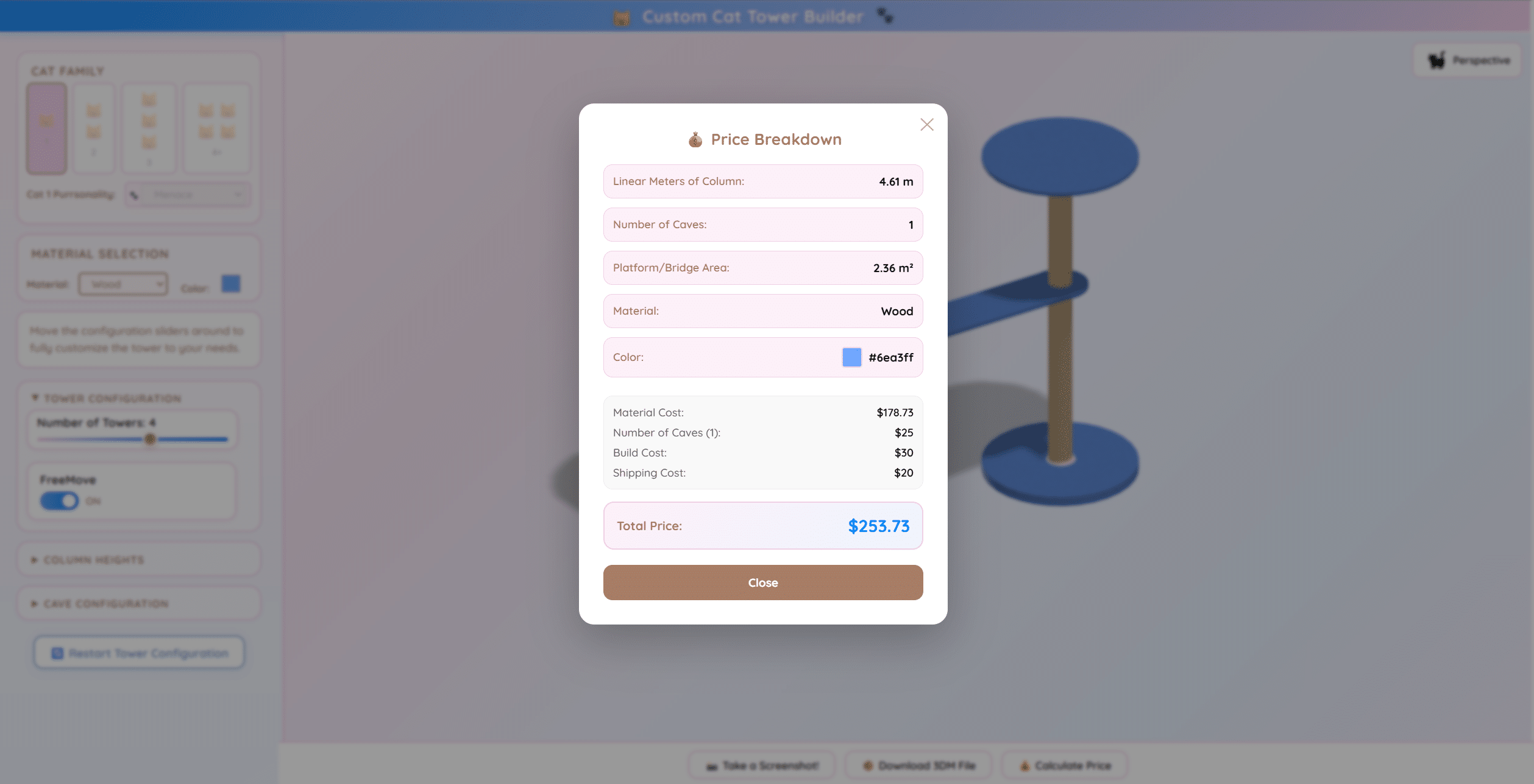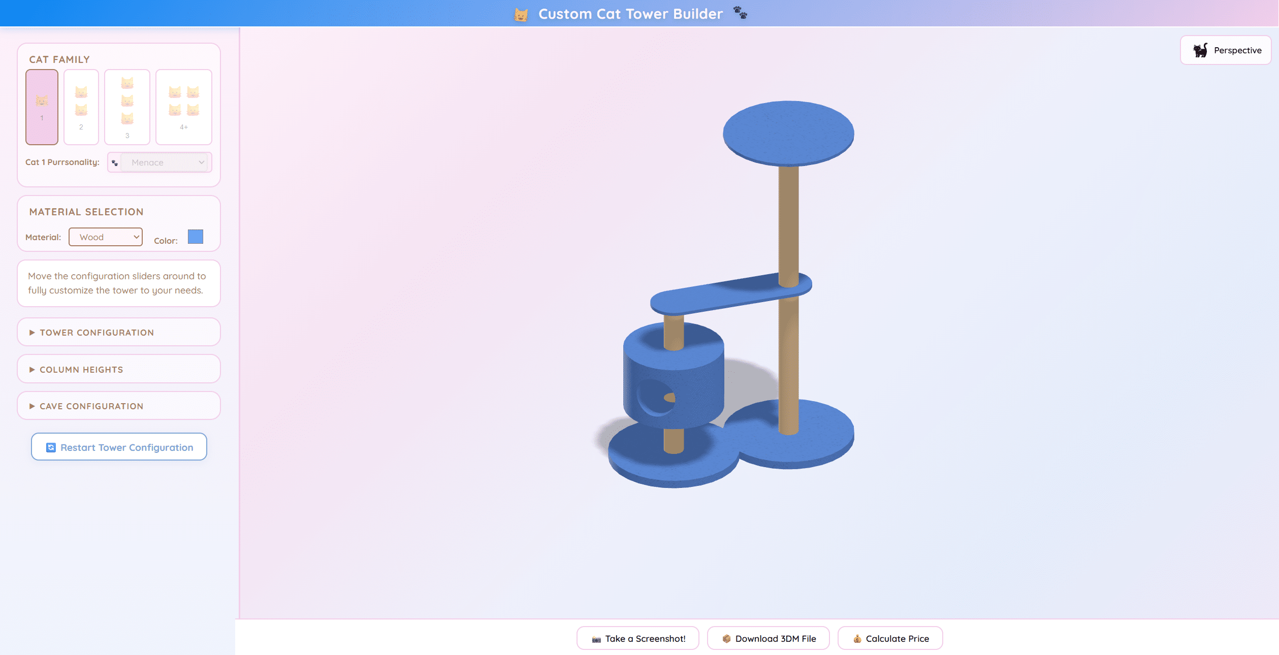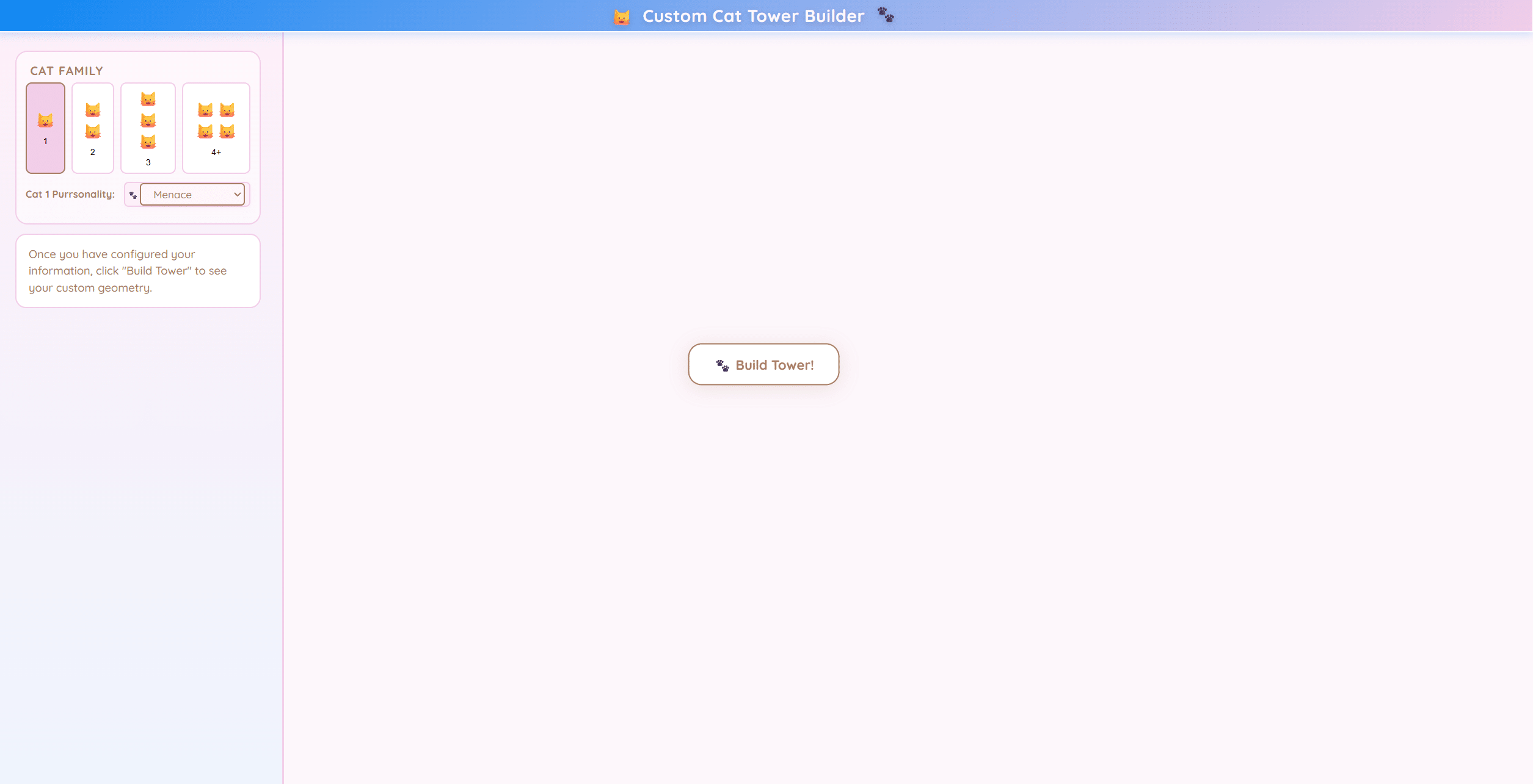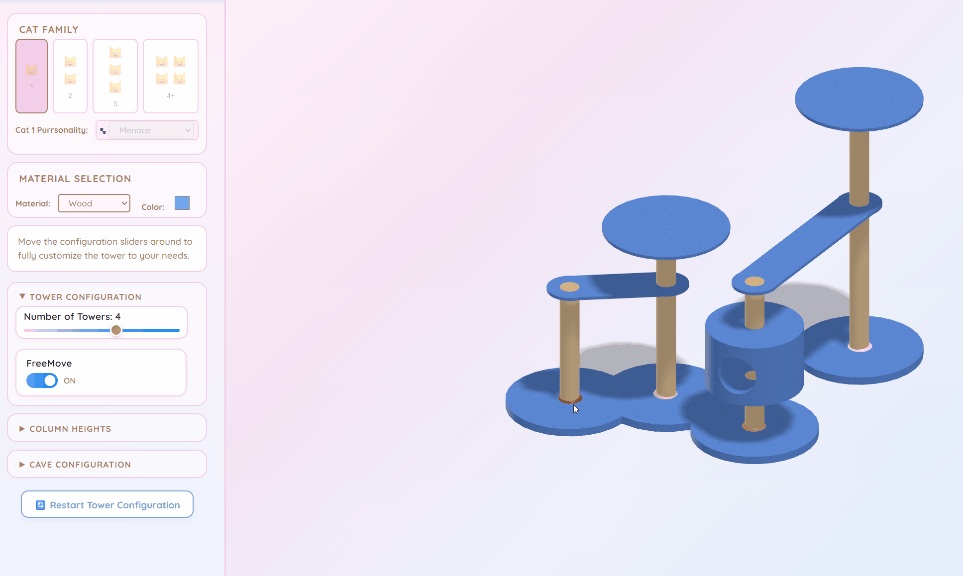The interaction begins with defining the number of cats (up to four), along with their general behavioral profiles. These inputs inform an initial tower configuration, generated automatically.