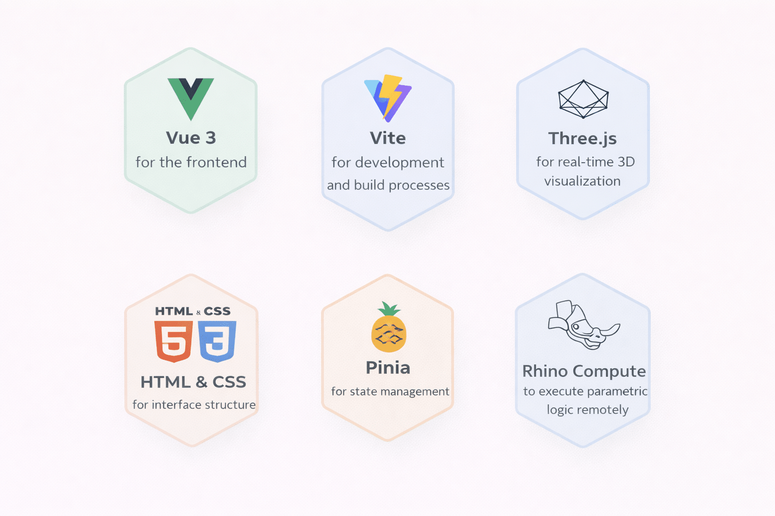The application is a web-based configurator derived from a Grasshopper definition, translating a parametric system into an accessible, user-facing tool.