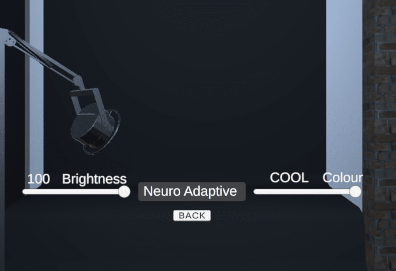 The project includes a virtual reality prototype developed in Unity. In this immersive dark room, light intensity, color temperature, and transition speed change based on emotional states like stress, attention, and calmness. For example, higher stress levels can create colder or more dynamic lighting, while calm states produce warmer and softer atmospheres. The transitions are smooth to create a natural spatial experience.