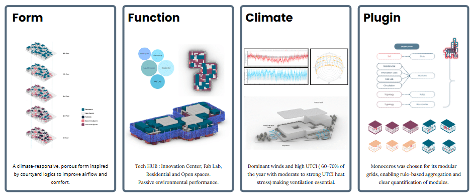 Aeralis is a climate-responsive Tech Hub composed of modular, porous blocks and patios, designed to enhance ventilation comfort. It is a project based on the winds of Cordoba, Argentina. The project aims to integrate the climatic challenges into architectural design. In doing so, designing a coherent structure with the climate and the site. For this, we used Monoceros as the main plugin in Grasshopper.