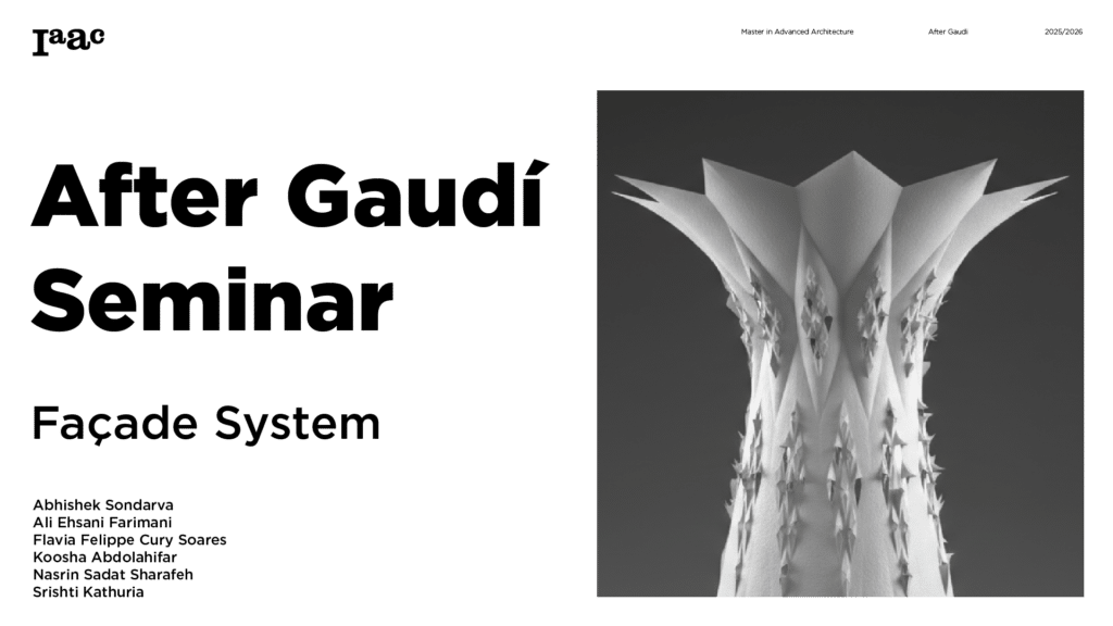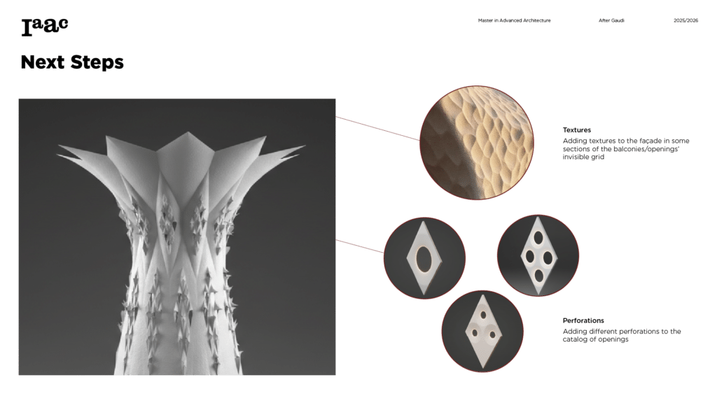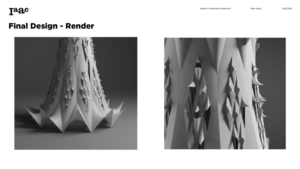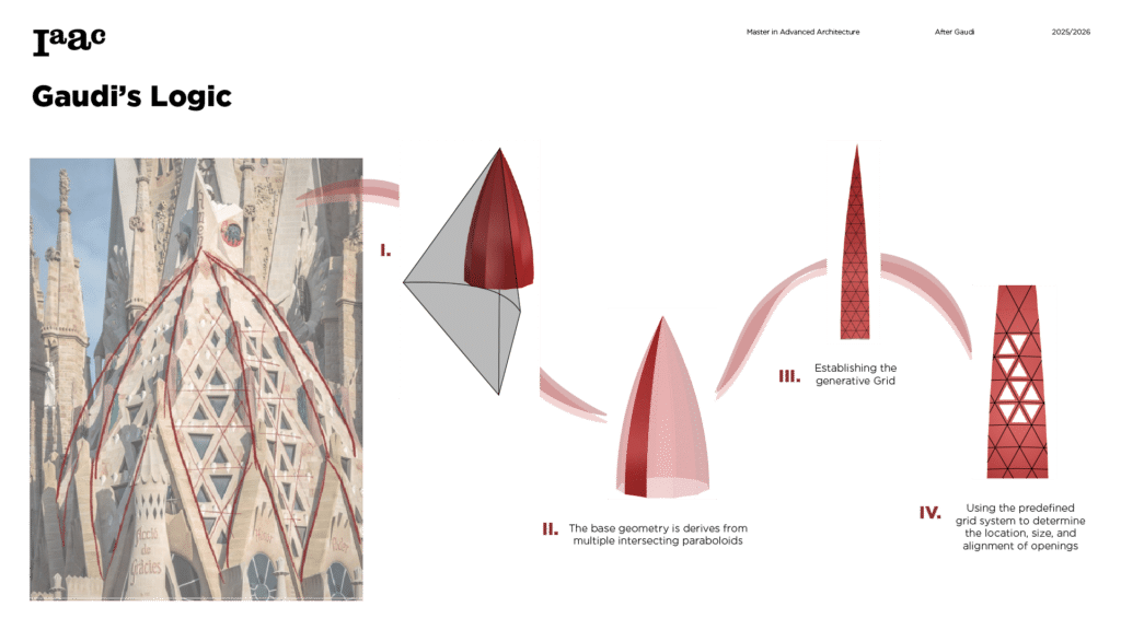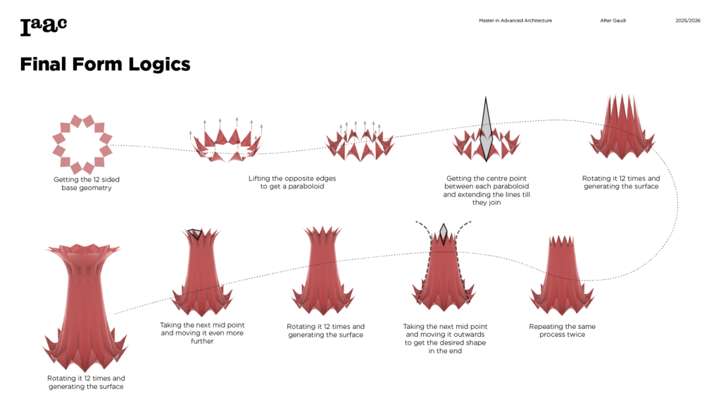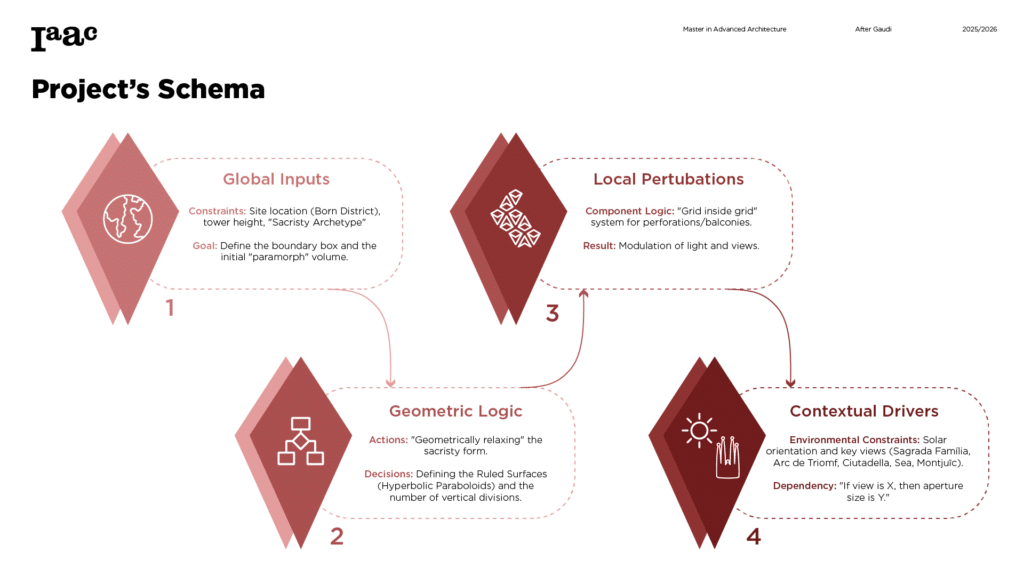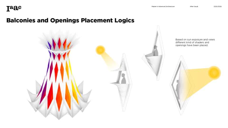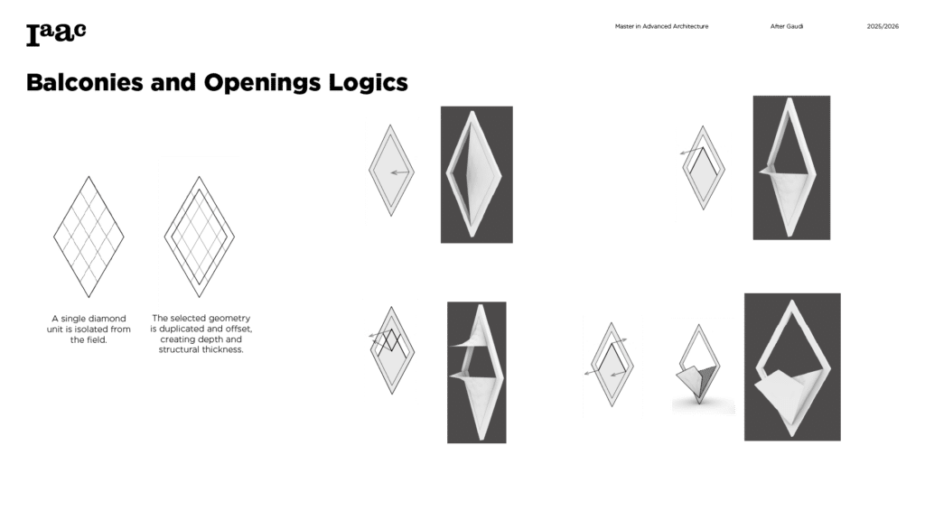 This project develops a parametric façade system inspired by the geometric logic of the Sagrada Família sacristy, translating Gaudí’s generative principles into a contemporary computational workflow. The tower form emerges from iterative transformations of a radial geometry using ruled surfaces and rotational operations, producing a continuous structure defined by gradual variation. A diamond-based grid organizes openings, balconies, and shading devices through localized perturbations, allowing the façade to regulate light, frame views, and create spatial depth. Rather than an applied envelope, the façade operates as a performative system integrating structure, environment, and experience through rule-based geometric differentiation.
