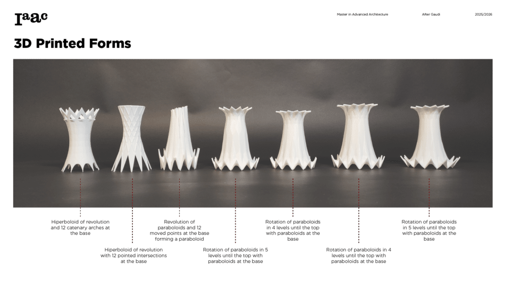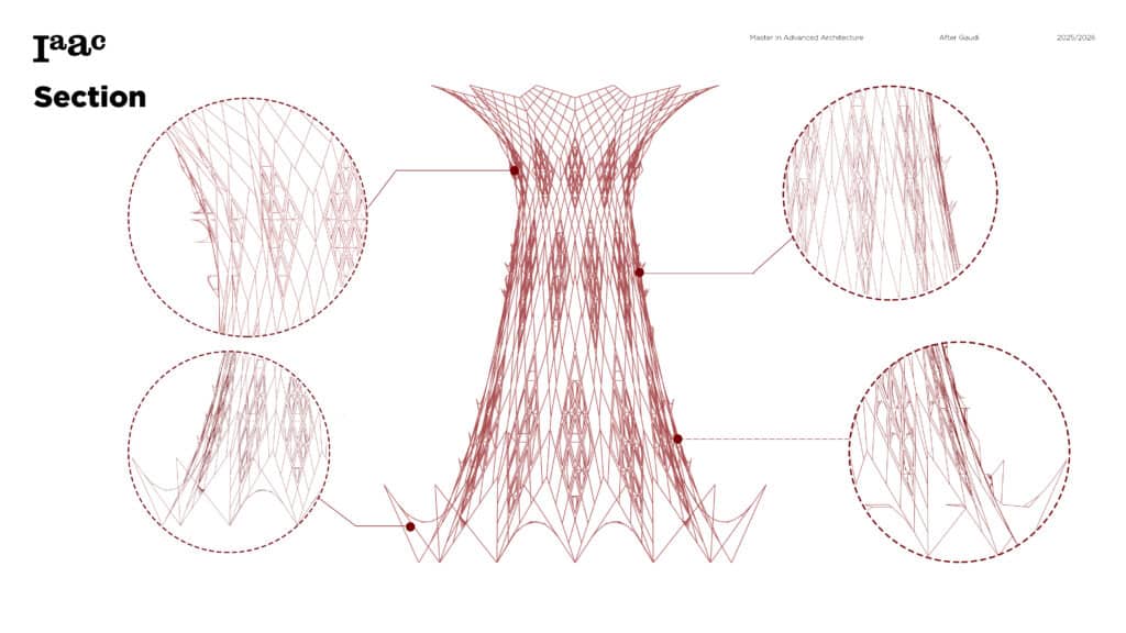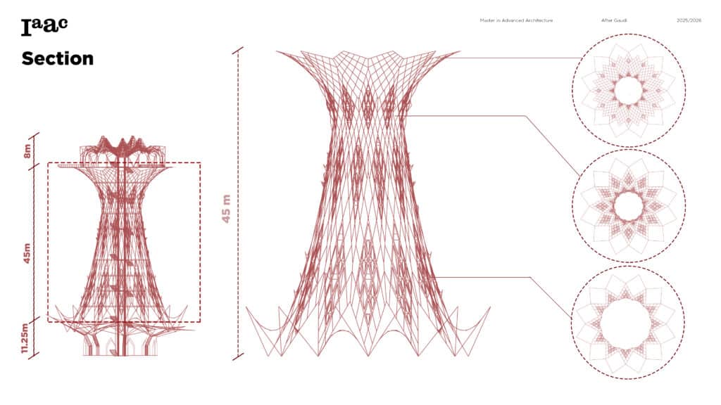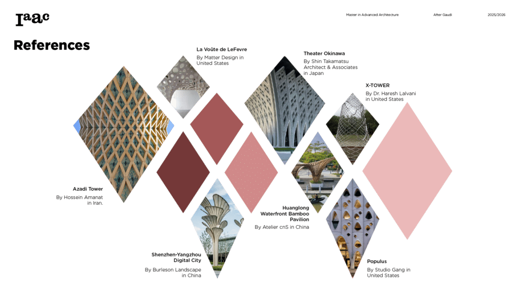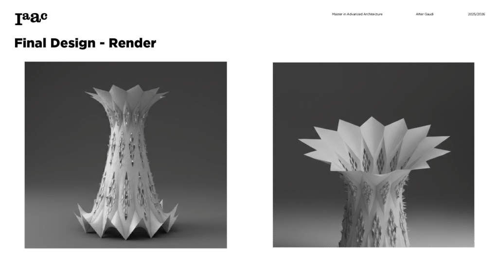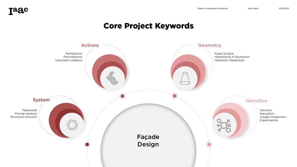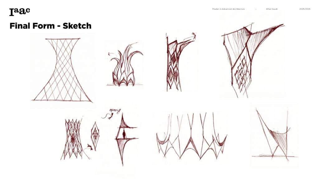 This project develops a parametric façade system inspired by the geometric logic of the Sagrada Família sacristy, translating Gaudí’s generative principles into a contemporary computational workflow. The tower form emerges from iterative transformations of a radial geometry using ruled surfaces and rotational operations, producing a continuous structure defined by gradual variation. A diamond-based grid organizes openings, balconies, and shading devices through localized perturbations, allowing the façade to regulate light, frame views, and create spatial depth. Rather than an applied envelope, the façade operates as a performative system integrating structure, environment, and experience through rule-based geometric differentiation.