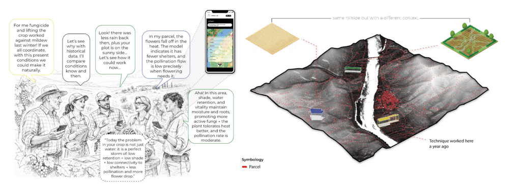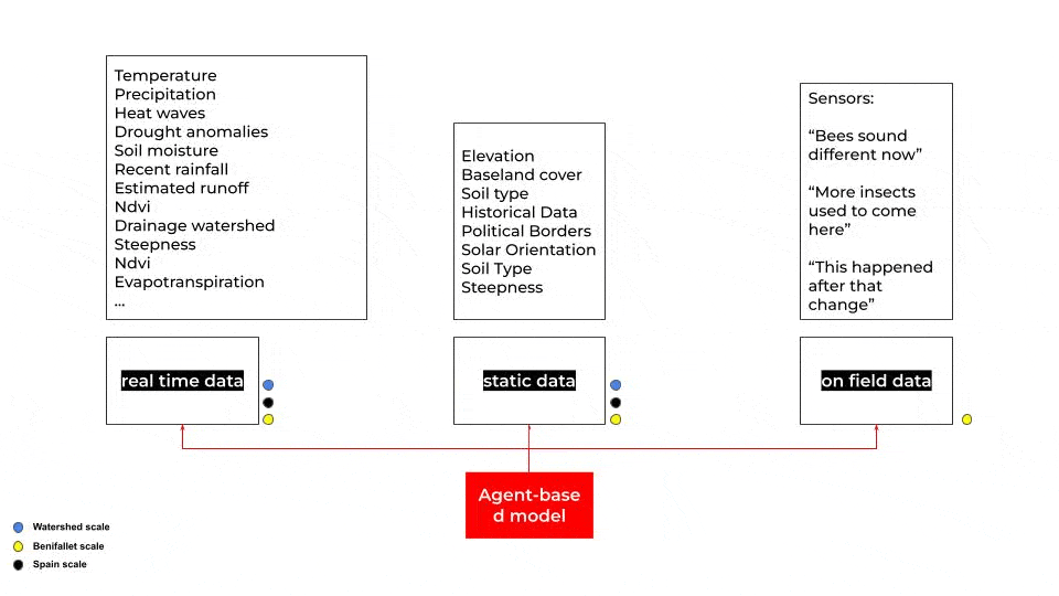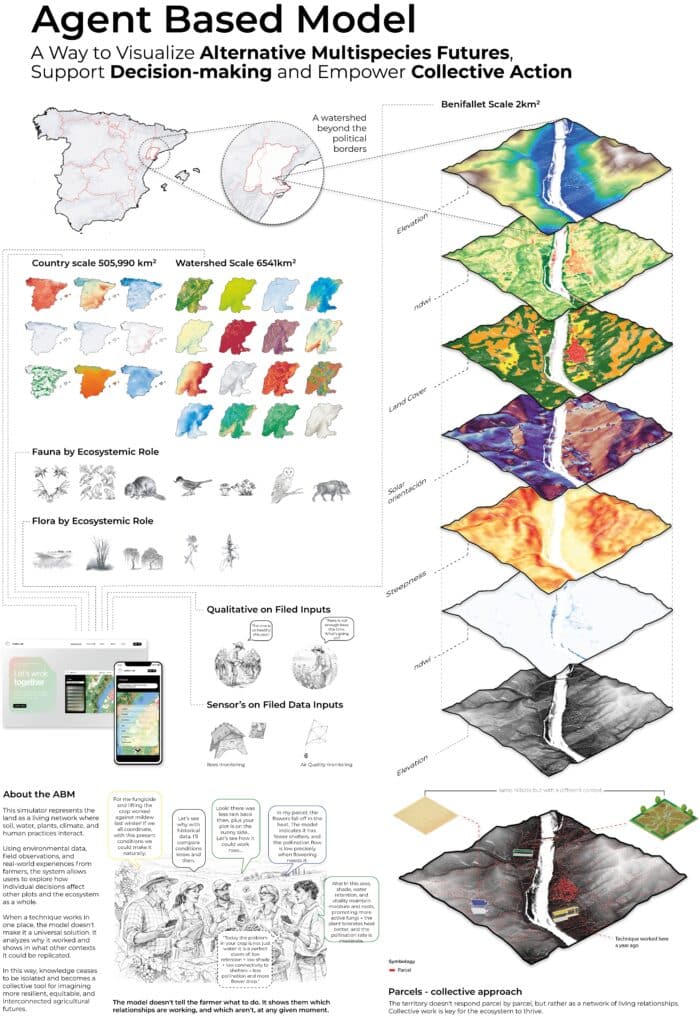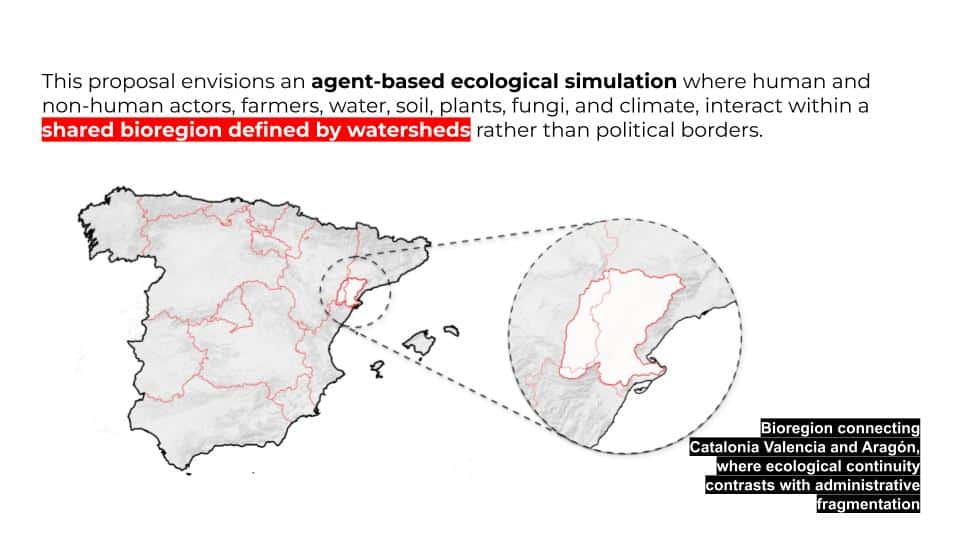 This proposal envisions an agent-based ecological simulation where human and non-human actors, farmers, water, soil, plants, fungi, and climate, interact within a shared bioregion defined by watersheds rather than political borders. Agricultural technicians serve as mediators between data and local knowledge. Agents are not merely data points but active participants in a living network, continuously shaping and responding to one another. The model doesn’t tell farmers what to do,it shows them which relationships are causing certain output. This is s space for dialogue, opening possibilities for cooperation, collective decision-making, and more resilient multispecies futures.