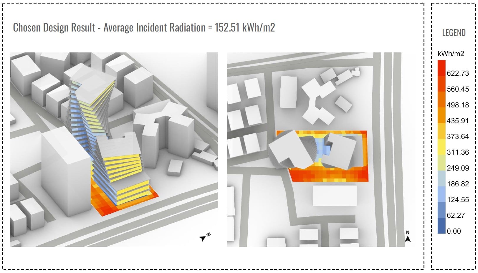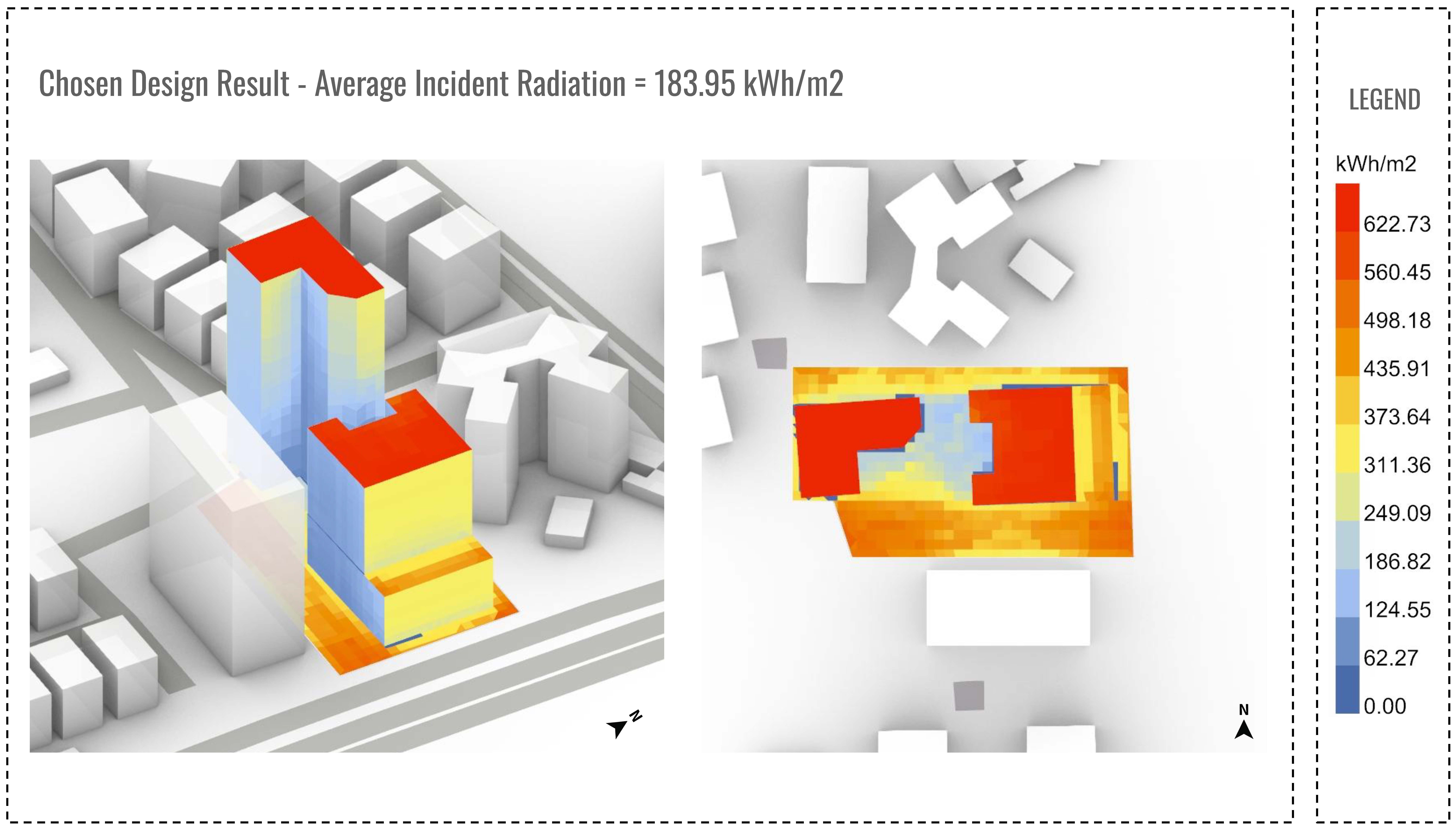 The initial optimization phase focused on minimizing the Average Incident Radiation across the mixed-use volumes by systematically exploring building movement and rotation. This phase resulted in a chosen configuration with an Average Incident Radiation of 183.95 kWh/m². This was the necessary first step to define the most efficient macro-geometry for the site.