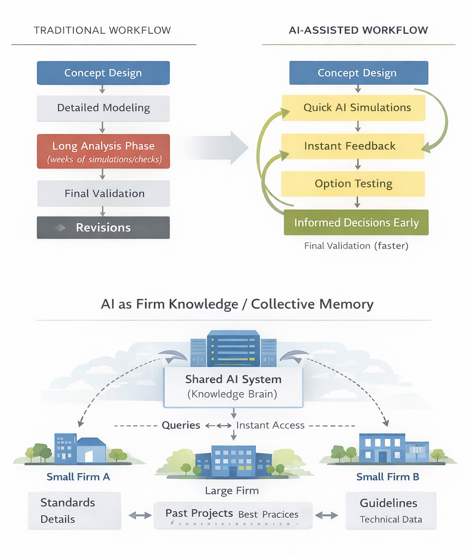 AI is also useful beyond design production. At an organizational level, large firms are beginning to use internal AI chatbots that allow employees to instantly query company standards, past projects, or technical knowledge. This functions almost like a shared institutional memory. It reduces onboarding time, improves consistency, and makes knowledge less dependent on hierarchy. If such systems become open or accessible to smaller firms, expertise could become more democratized across the industry.