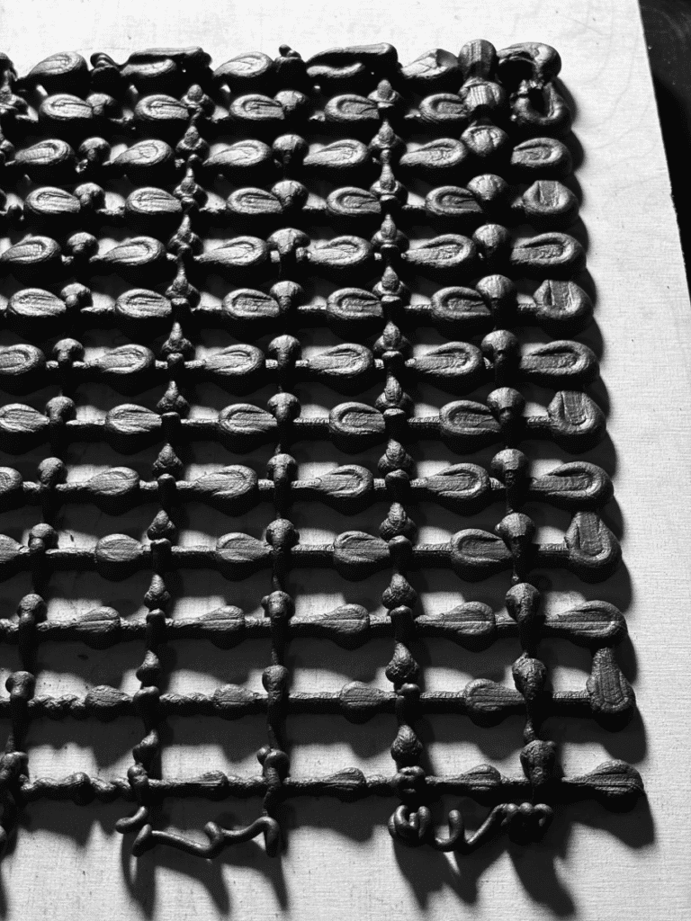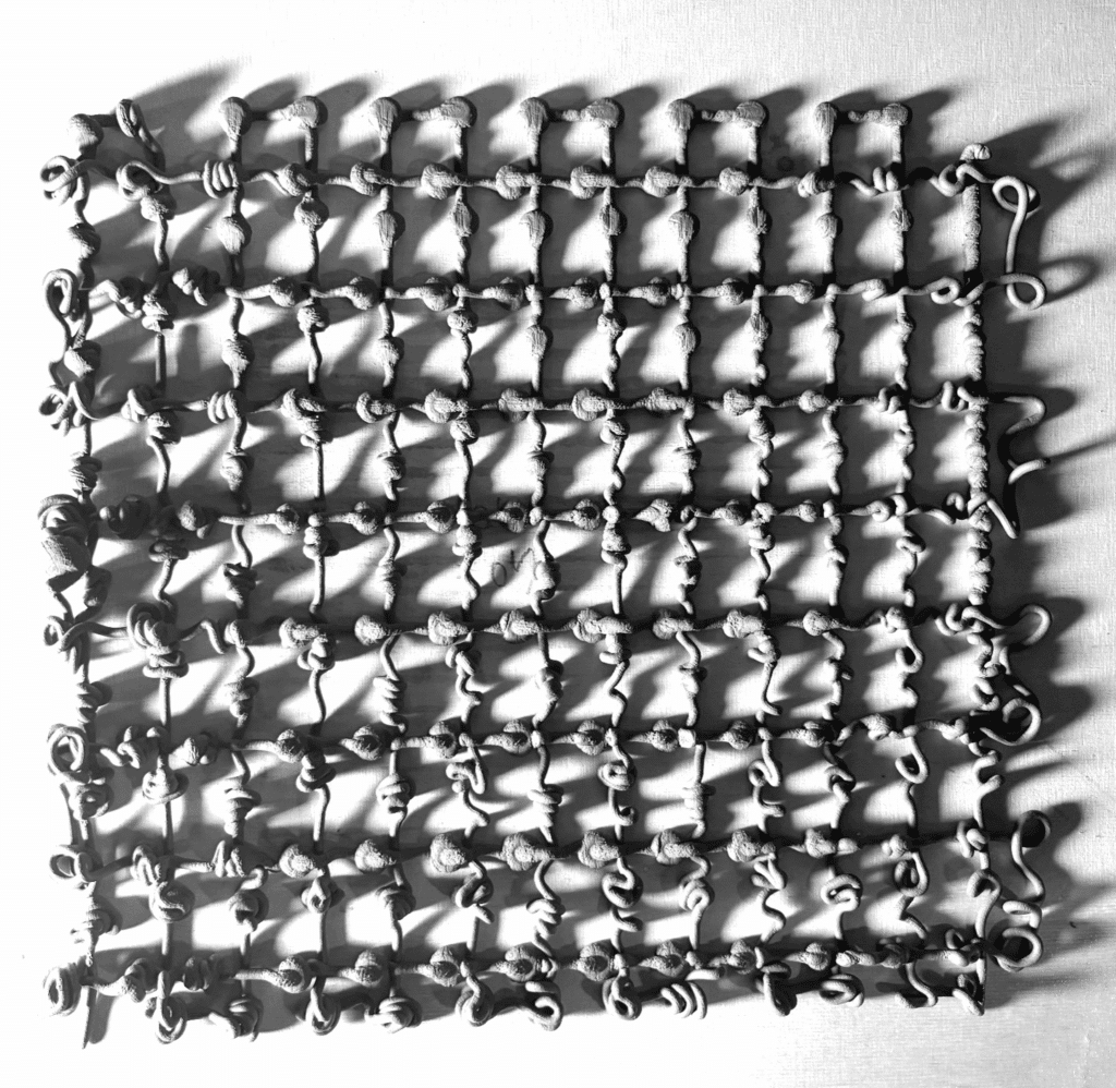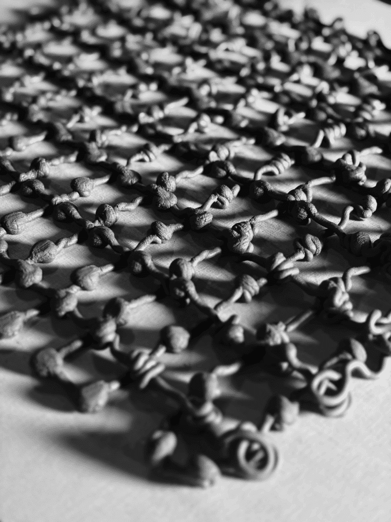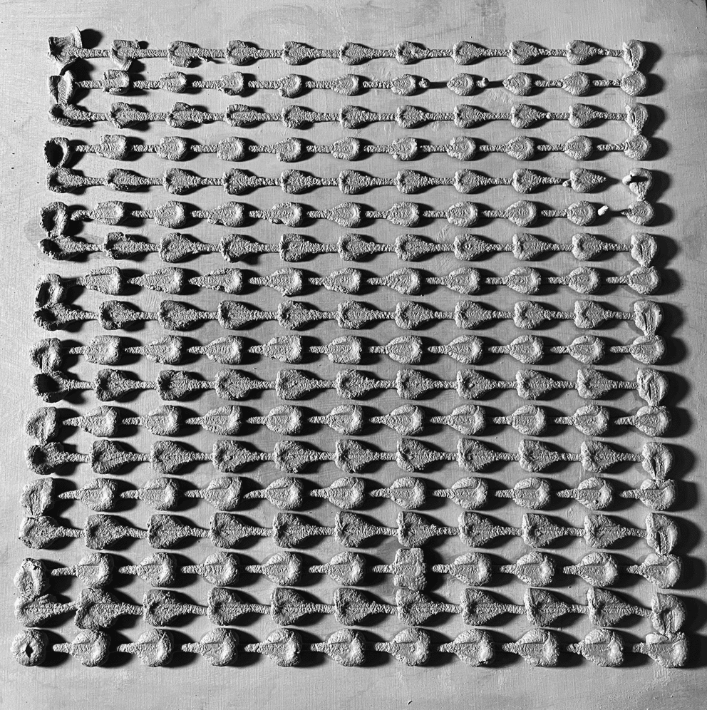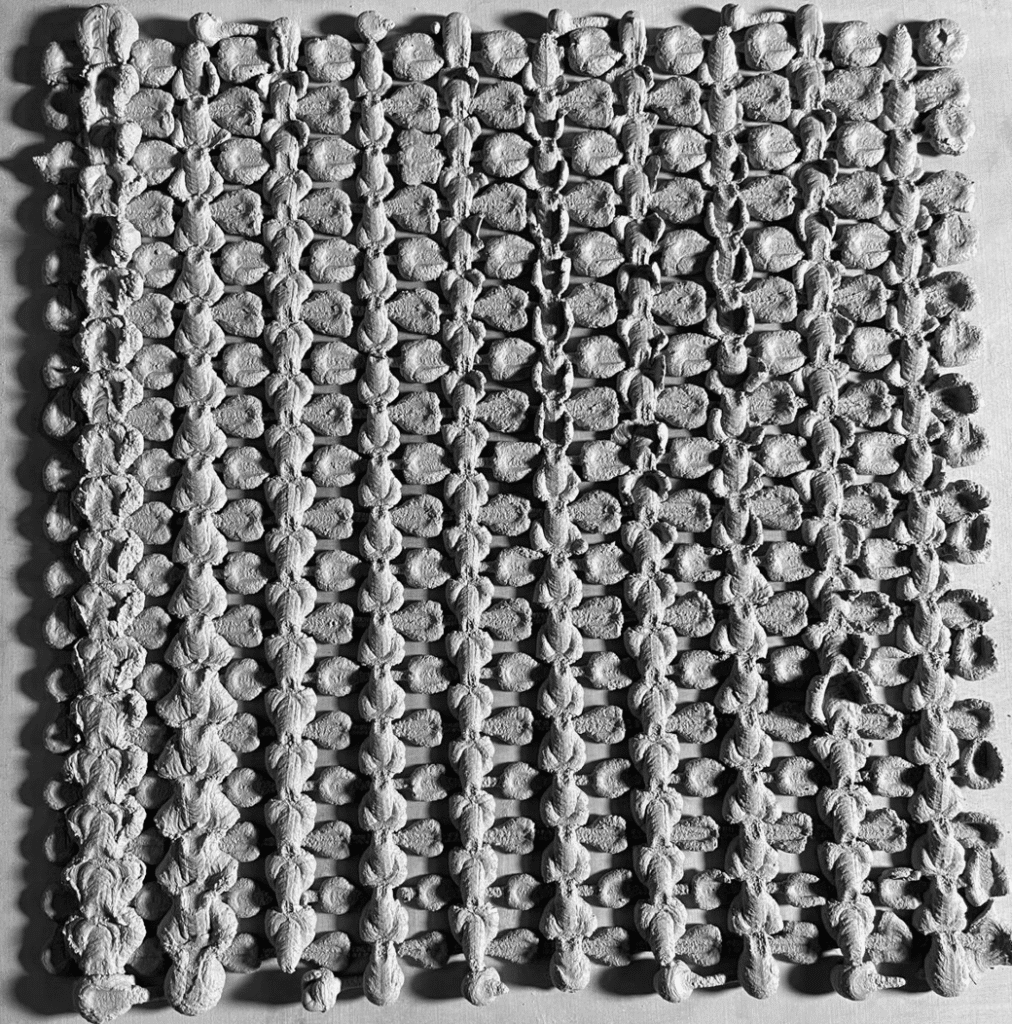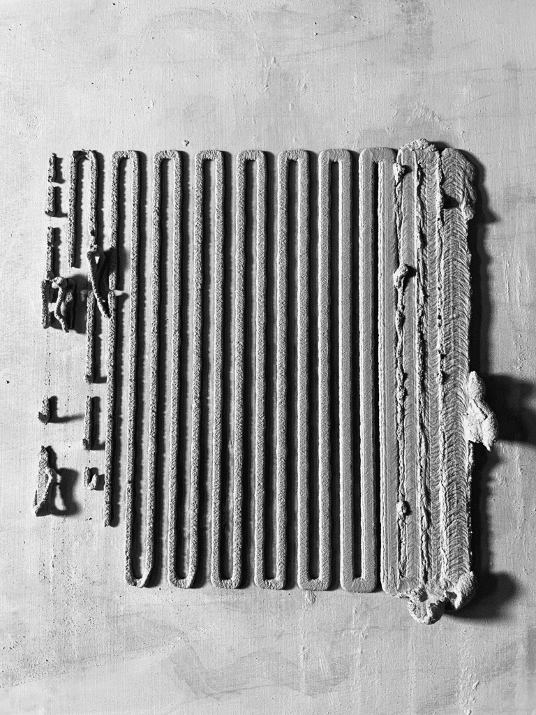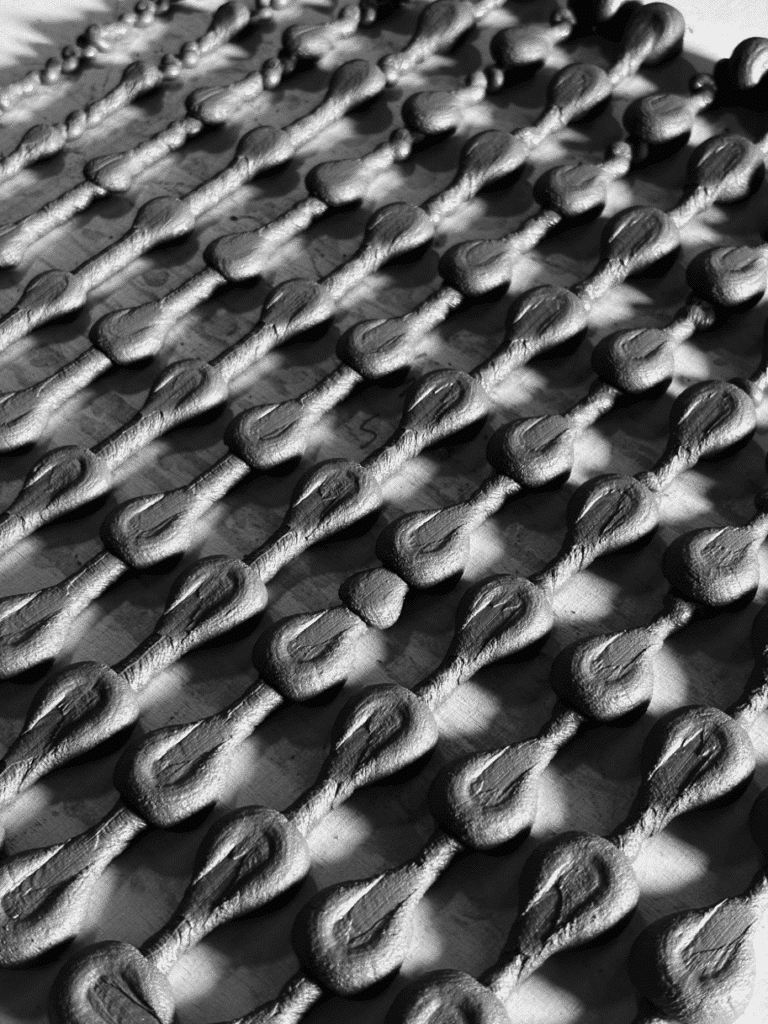 The blobs were arranged in two layers forming an orthogonal grid, allowing us to read variations systematically. Beyond generating gradients based on height and waiting time, the blob patterns also visually recorded the directionality of the robotic arm, embedding the machine’s movement logic into the geometry itself.