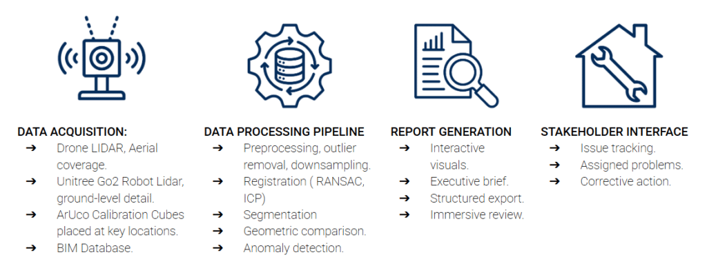 The core of our pipeline is built upon a robust, modular workflow designed to transform raw, noisy scan data into a precise, actionable digital twin. We begin by utilizing RANSAC plane segmentation to reliably detect and remove dominant floor surfaces, followed by DBSCAN clustering to isolate the target object from noise and floating fragments. To address scale drift, we integrate ArUco markers that serve as consistent, high-precision reference points, allowing us to align the raw point cloud accurately with the global coordinate system of the BIM database.