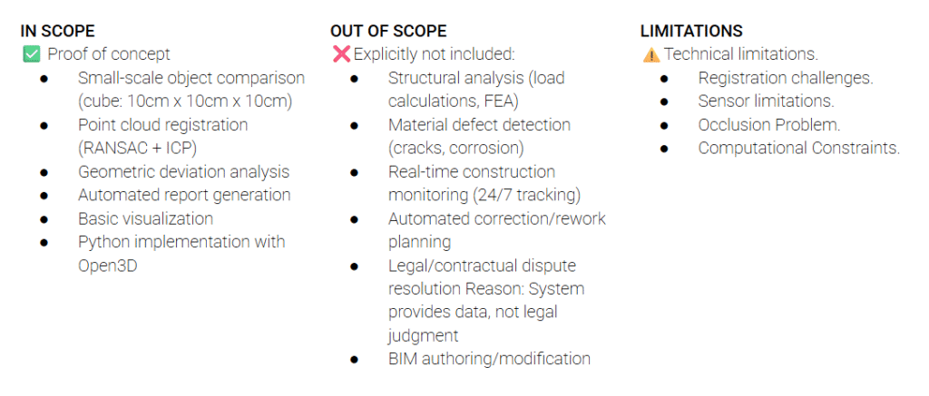Once the object is isolated, the system executes a refinement process to ensure stable geometric representation. Rather than relying on unstable normals clustering, we define the object’s local XYZ frame using plane-based axis definition through cross-products of fitted orthogonal faces. This aligned data is then passed to a comparison engine that calculates geometric deviations against the design model, applying a tolerance filter to isolate only the differences that exceed 15–30mm. This processed information is finally classified into a trade-specific filtering engine, which ensures that only relevant anomalies—such as duct clashing or pipe route obstructions—are presented to the specific contractor responsible for that work.