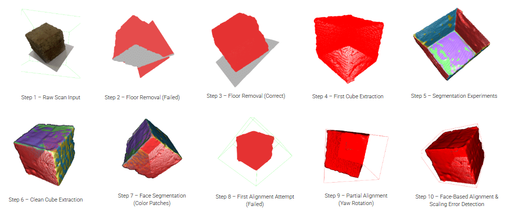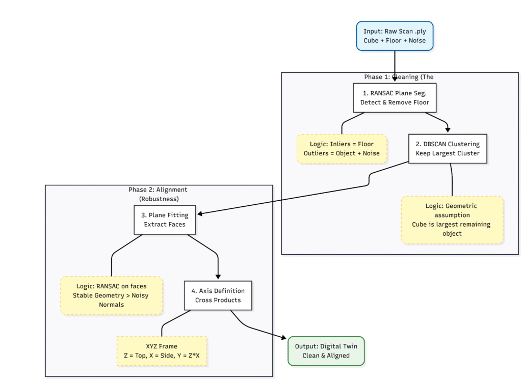 The technical core of the ARCS pipeline focuses on robust geometric processing rather than reliance on size heuristics. Our workflow begins with raw LiDAR/photogrammetry data, which inherently contains noise and floor planes that complicate automated measurements. We successfully implemented a modular architecture using RANSAC plane segmentation to robustly detect and remove floor surfaces, followed by DBSCAN clustering to isolate the target object from stray fragments