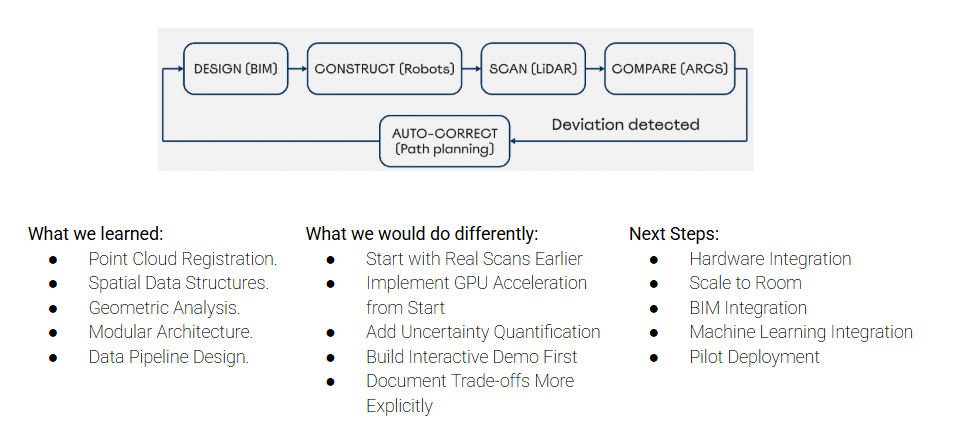 The development of ARCS demonstrates that complex system architecture can be effectively managed through modular, data-driven design, fulfilling the core requirements of our Software II project. While our current proposal focuses on a proof-of-concept for small-scale objects, the methodology proves that proactive as-built verification is not only technically feasible but economically imperative for reducing construction waste. Future steps include scaling this system to room-level environments, integrating machine learning for automated anomaly detection, and pursuing pilot deployments. Ultimately, ARCS represents a significant step toward a construction future where trades operate based on accurate, real-time data, significantly reducing the financial and temporal costs of traditional site coordination.