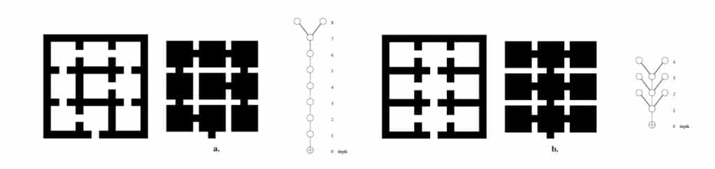 Space syntax is an analytical framework used in architecture and urban planning to evaluate how spatial layouts influence human behavior. By mapping spaces as interconnected networks, it reveals movement patterns, social interactions, and accessibility levels, through j-graph (justified permeability graph) and Provides three main indexes: