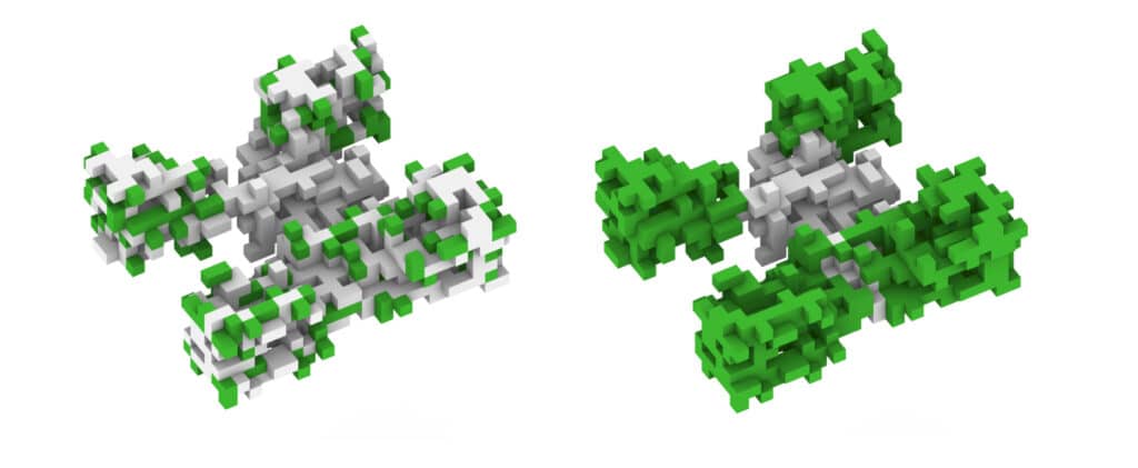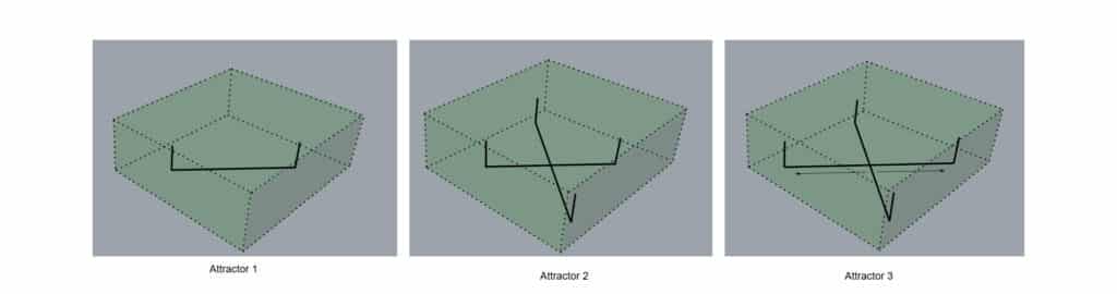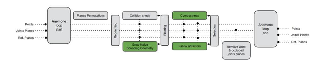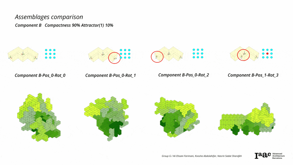 This approach outlines a tailored adjustment of the reference logic by altering the method of geometry filtering and selection within the loop. The horizontal and vertical limits of the site are established by a box of a specific dimension. This allows us to manage the construction height both above and below the ground, as well as the horizontal boundary. In order to develop spectrum of assemblages that are topologically configured to facilitate different patterns of movement, gathering and separation , two attractor curves are identified. And, by utilizing compactness as another selection criterion, the growth is guided around these curves in a controllable compact manner.