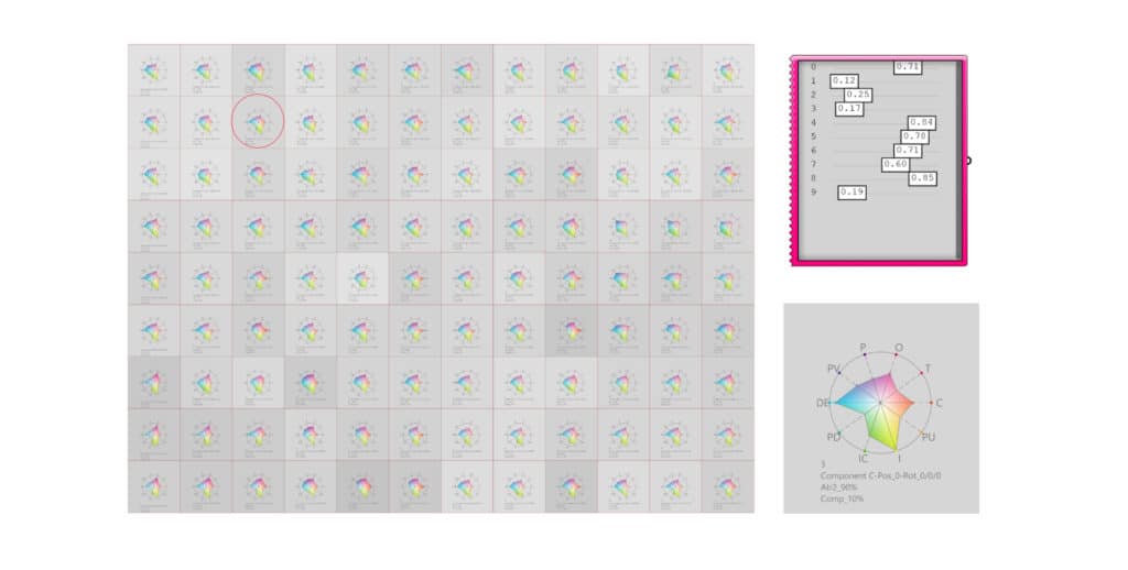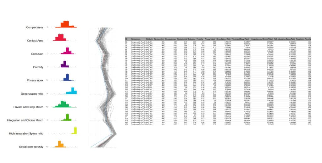 First, the foundational geometry of the directors alters the global network: a single curve generates linear or dendritic configuration, whereas two intersecting curves establish a distributed, interconnected configuration. Second, the spatial reach of these curves dictates the pattern’s centrality. Extending the directors toward the boundary corners decentralizes the layout, producing articulated patterns with increased depth. Conversely, retreating them toward the center consolidates the integration core, resulting in a shallower, more cohesive configuration. Finally, the overall depth-to-integration ratio is governed by a fundamental configurational rivalry. The attractive strength of the curves pulls the assemblage outward, generating deep, segregated branches. This is directly countered by the systemic drive for compactness, which minimizes depth to maximize integration. Modulating this tension between linear attraction and systemic compactness enables morphological control over the emergent syntactic properties of the final configuration.