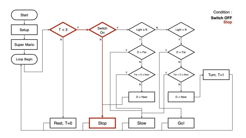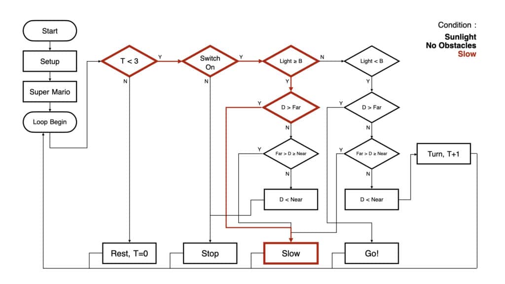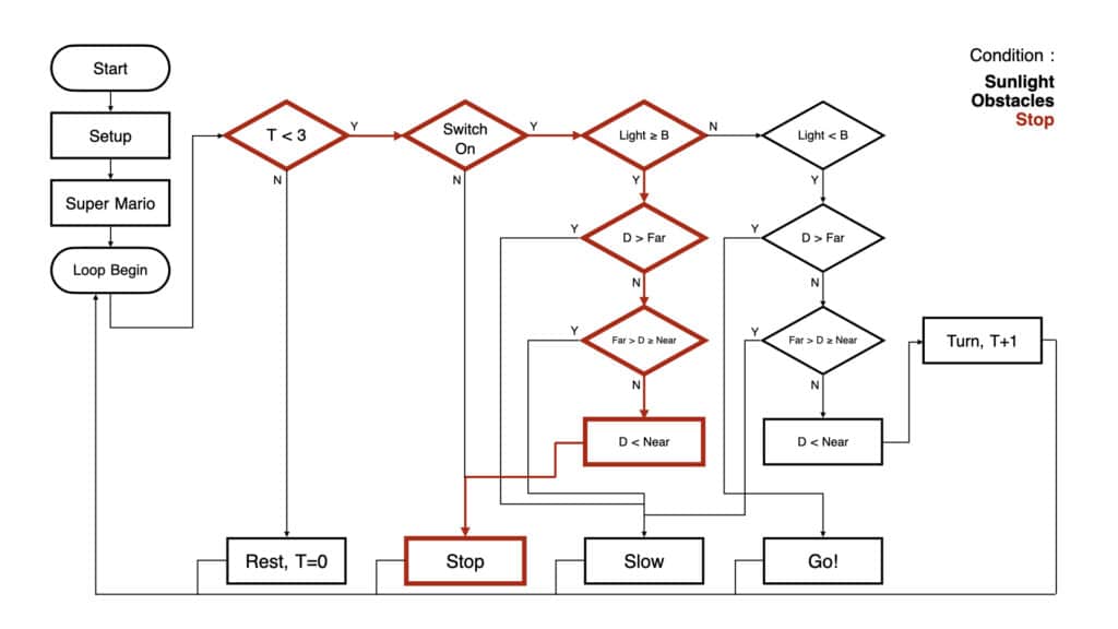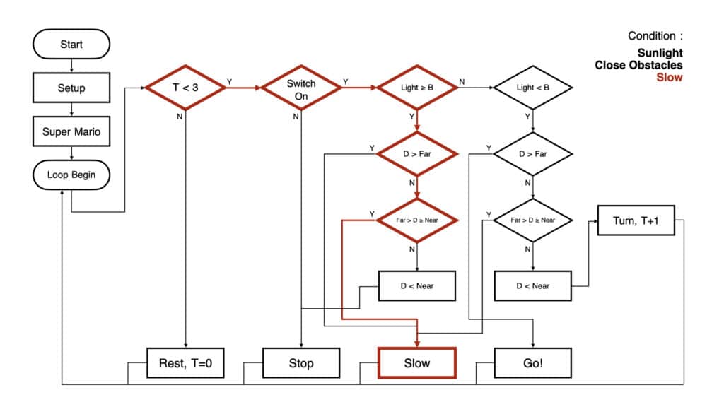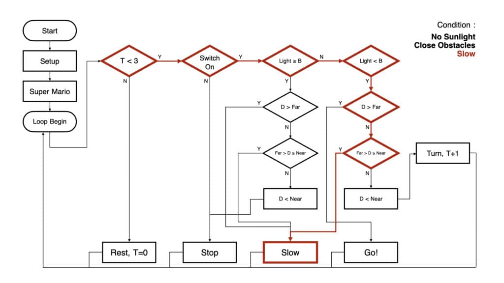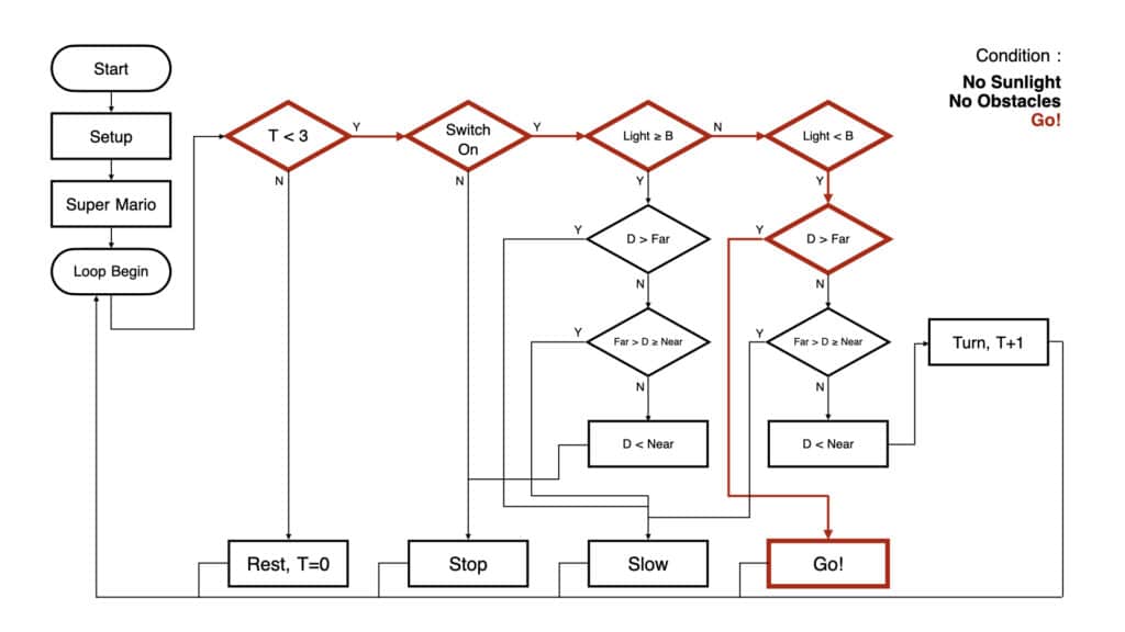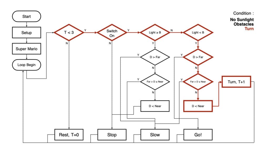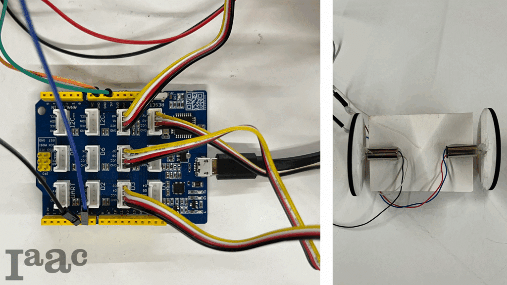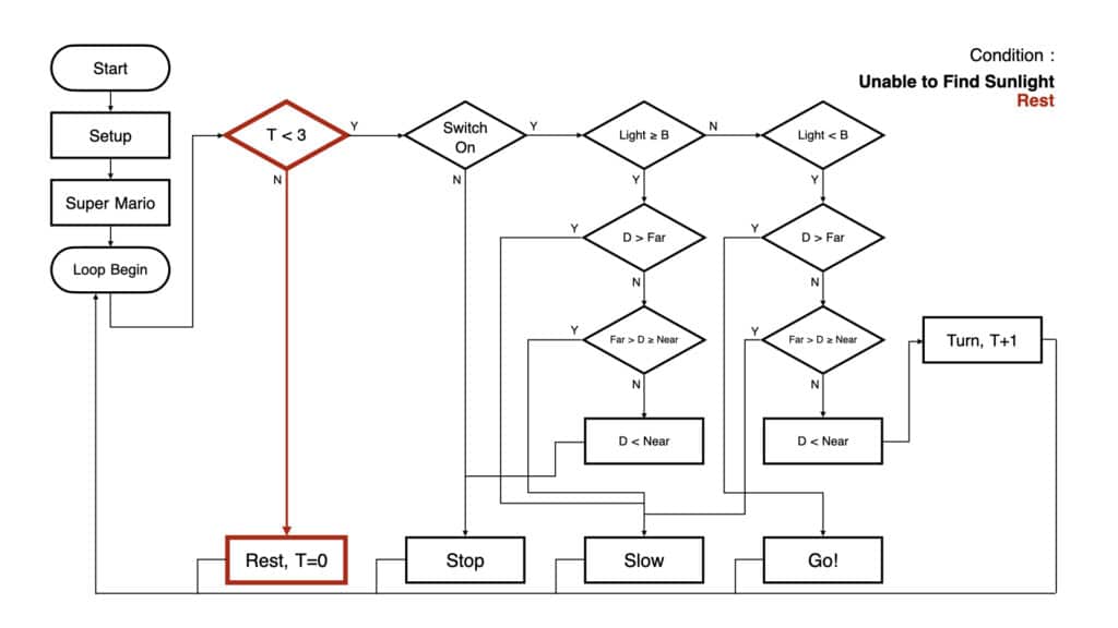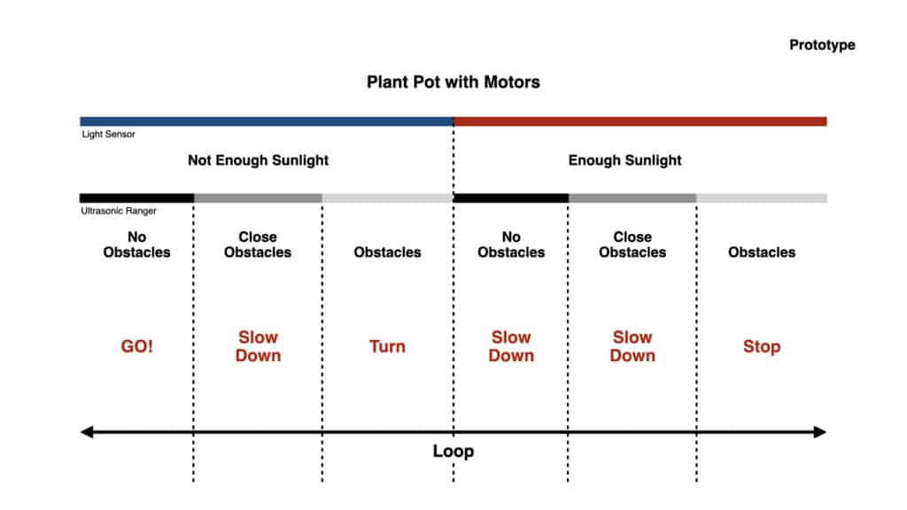 As a prototype of this concept, a plant pot with embedded mobility was developed. The system uses three sensors (a light sensor, an ultrasonic ranger, and a rotary angle sensor), two DC motors, and a buzzer. Based on the amount of sunlight and the presence of obstacles, six conditions are defined, each triggering a specific motor behavior. The pot moves slowly when sunlight is sufficient and obstacles are not critical, and it actively searches for light when sunlight is lacking. Upon detecting nearby obstacles, it slows down or stops, and if blocked, it rotates to find a new direction. After repeated unsuccessful turns, it pauses briefly before trying again, assuming that direct light might not be available momentarily.