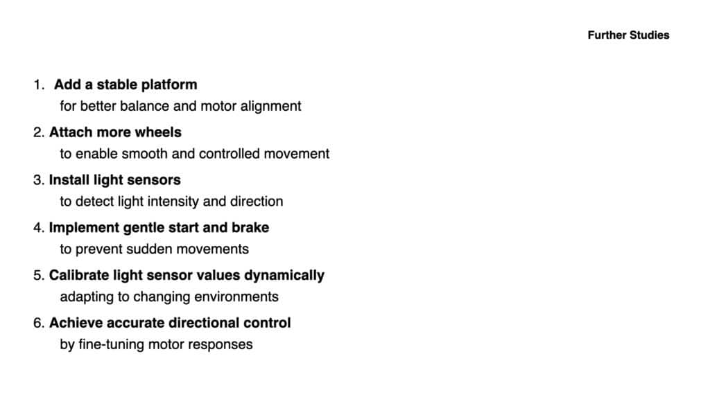 Future development could include designing a more stable physical platform with additional wheels, implementing bidirectional motors for smoother motion, and improving both software algorithms and sensing accuracy. Ultimately, Autonomous Plant suggests a model in which plants can autonomously position themselves to thrive—functioning not only as passive greenery but as active architectural elements.