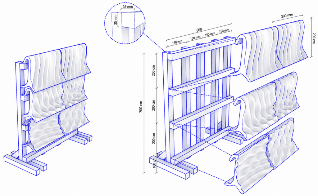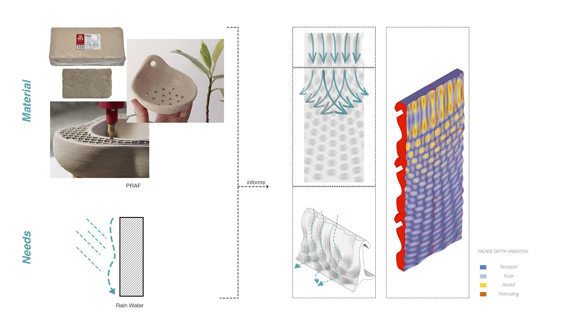 The design concept of our system is inspired by water performance and rainfall. Through a parametric 3D printing process, we aim to create a surface that captures the fluidity and movement of water. The tiles are intended to be finished with glossy glazes in vibrant colors, allowing the façade to visually evoke the reflective and dynamic qualities of rain.