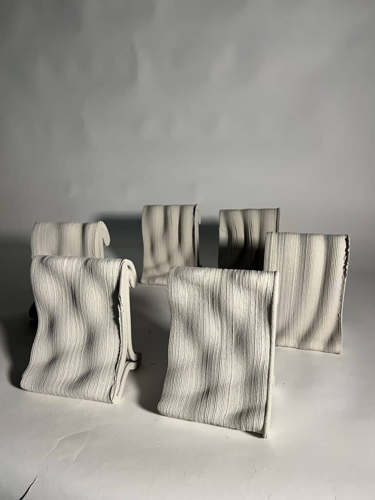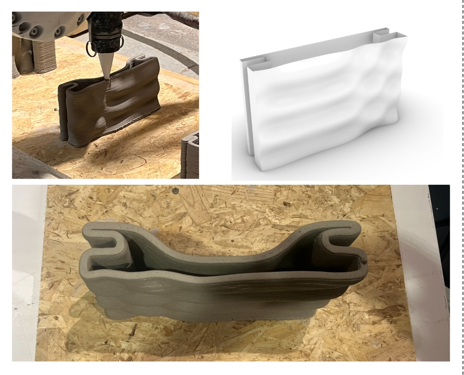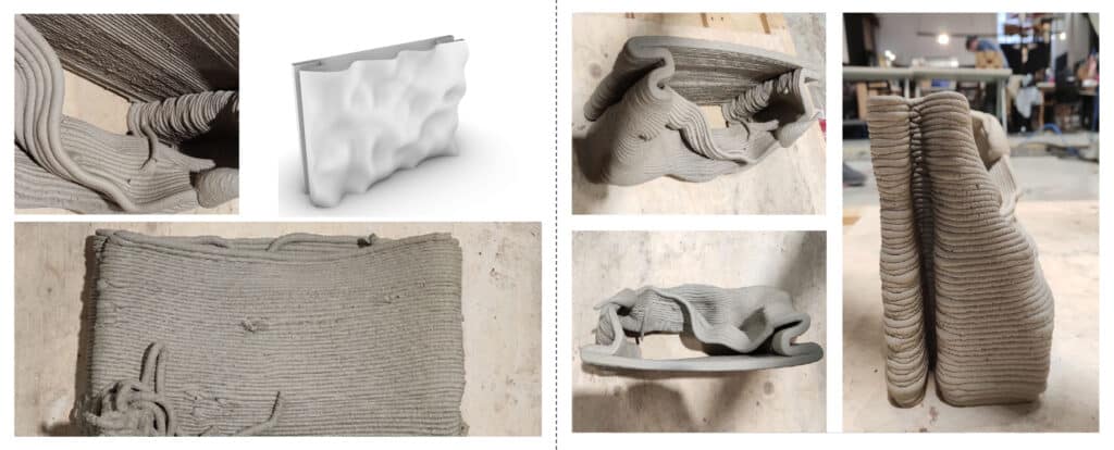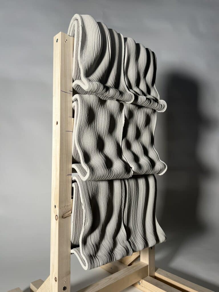 B. The Waves explores robotic additive manufacturing using ceramic clay to create a ripple-driven parametric facade. Developed in the IAAC Master in Advanced Architecture, the project utilizes an ABB IRB 6700 robot and WASP extruder to 3D print wall cladding tiles. The computational logic employs Grasshopper and attractor points to simulate water droplets, generating continuous toolpaths with overhangs under 45 degrees for structural stability. The components assemble onto a timber and steel substructure, demonstrating how robotic fabrication informs architectural design.
