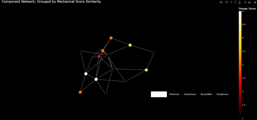 We created a network graph using python where each item in the machine was values individually based on scores given by our analysis. The following are the parameters: Electrical, Mechanical, Importance of the component in the machine, Recyclable factor and Danger?