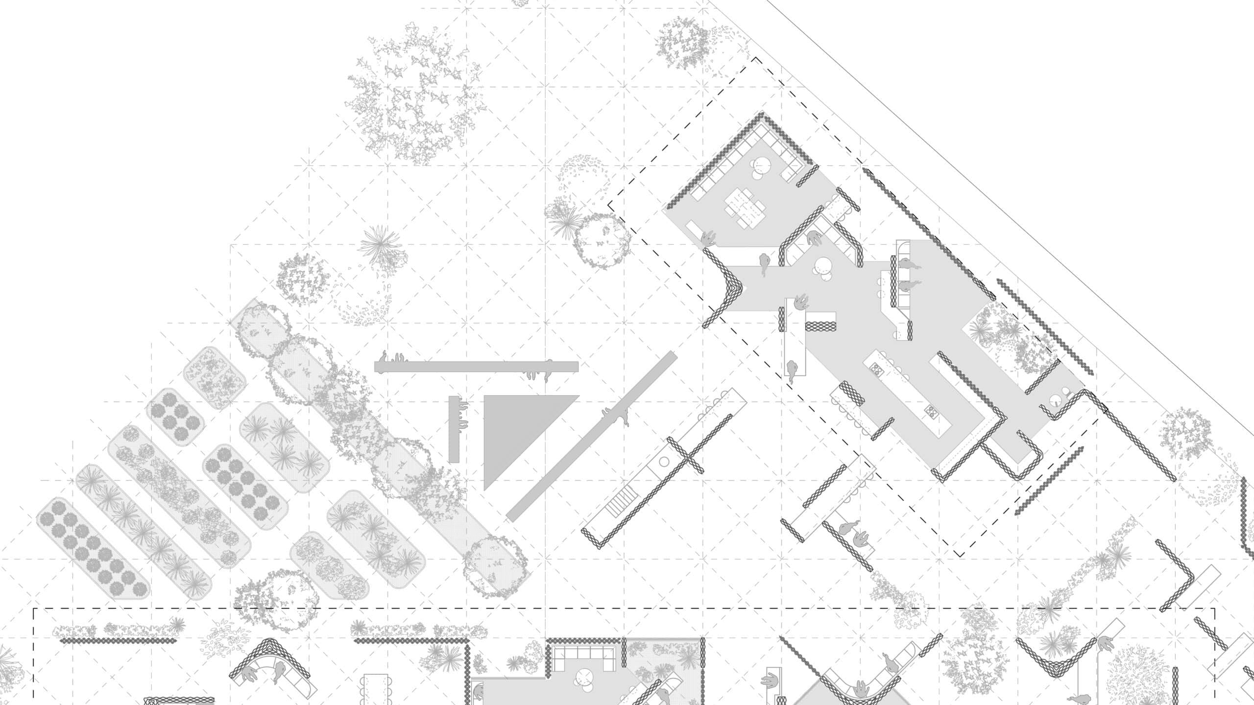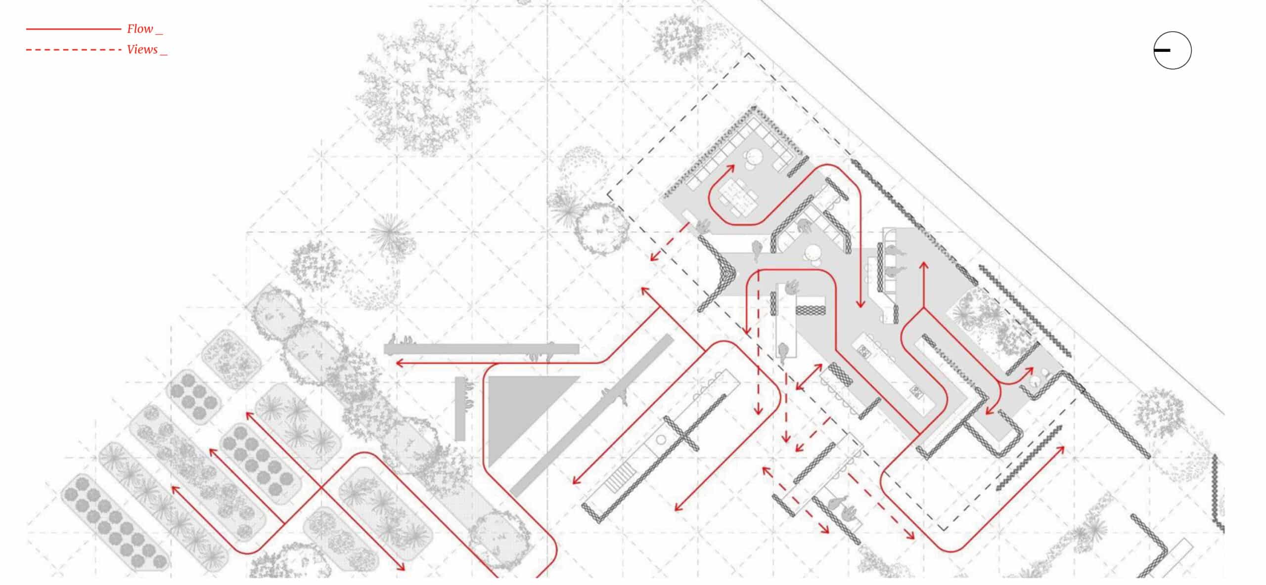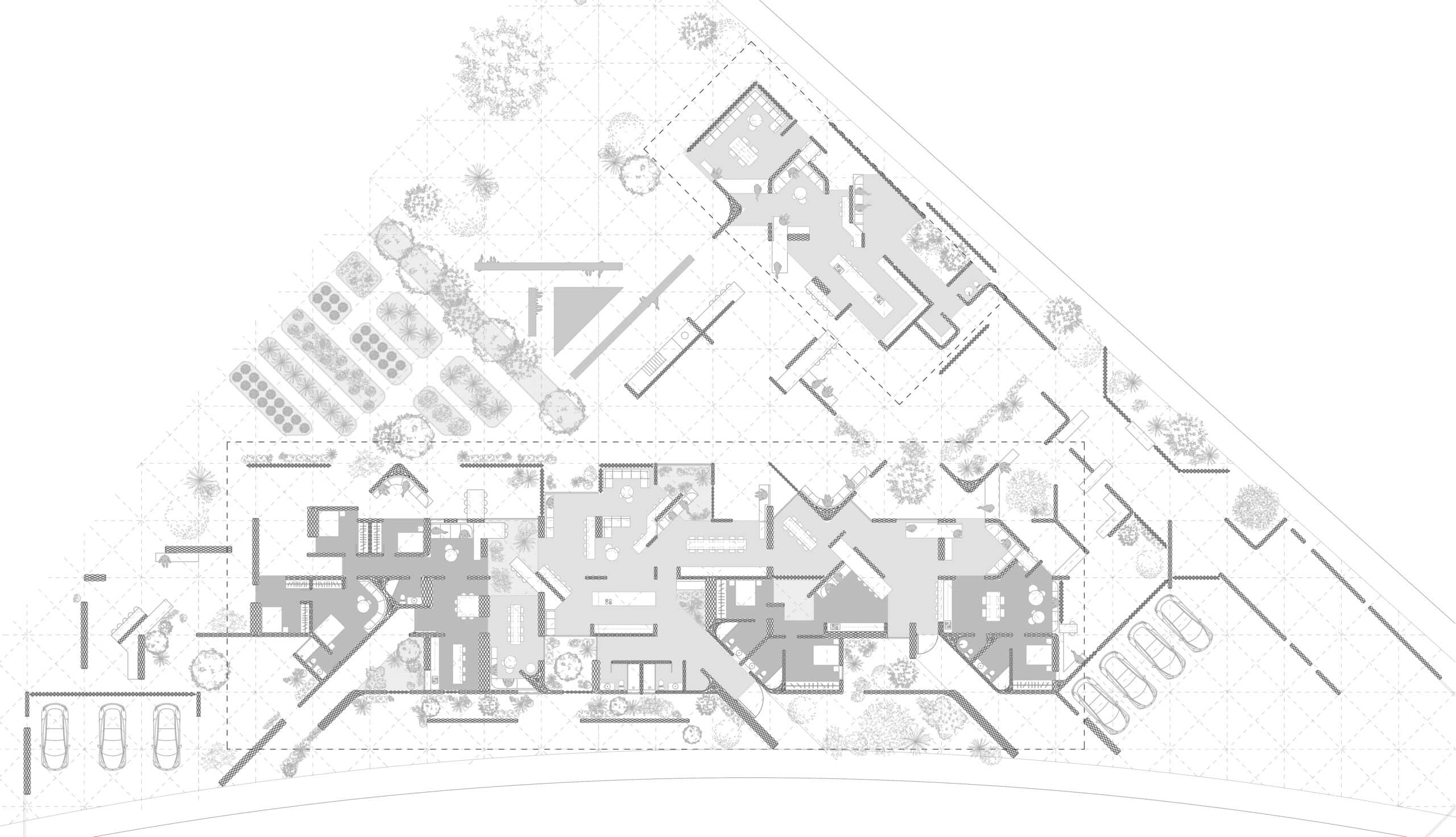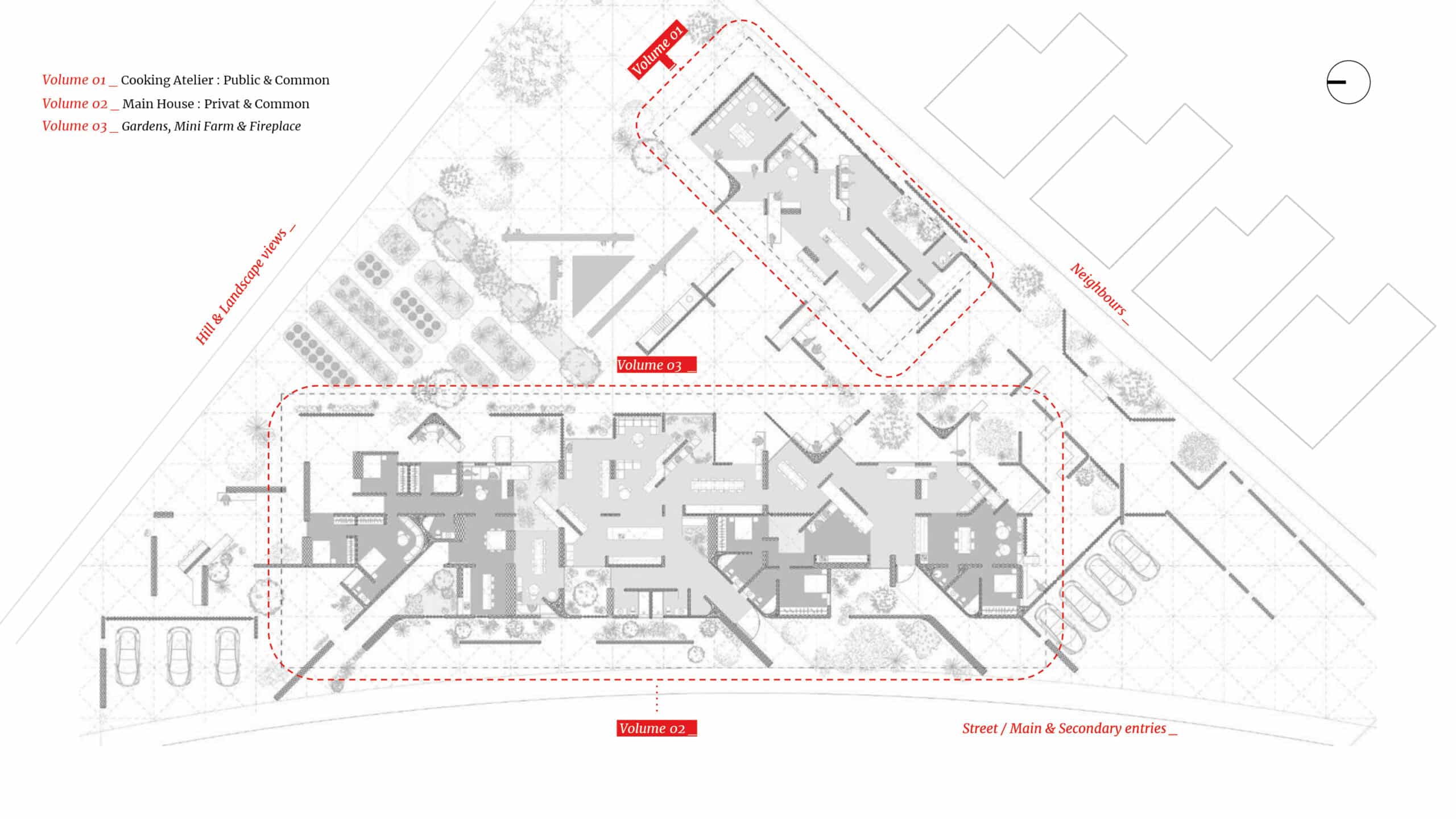 The program is laid out on the site, following an orthogonal grid towards the street, turning its back to it, and then beginning to break and open diagonally towards the hillside and the landscape views. There are mainly 2 volumes: the main residence and the cooking atelier, which then come together in an outdoor area of gardens, mini farms, a fireplace, and an open-air kitchen-BBQ.