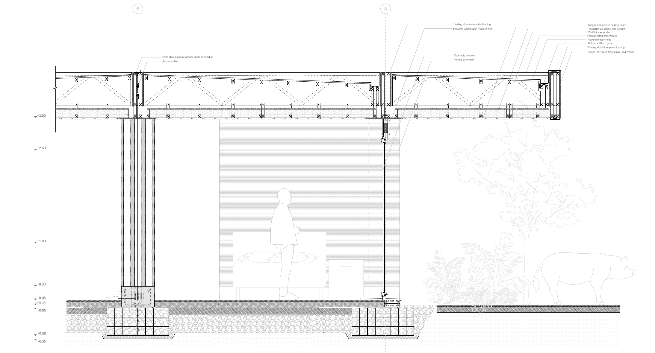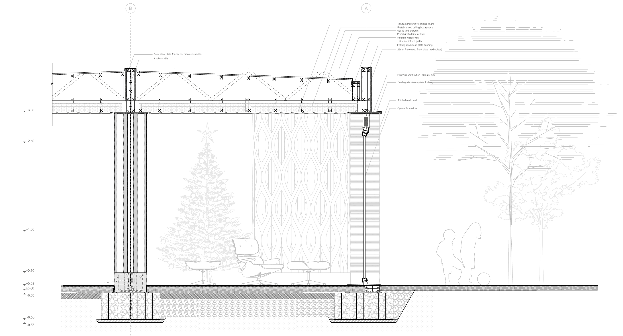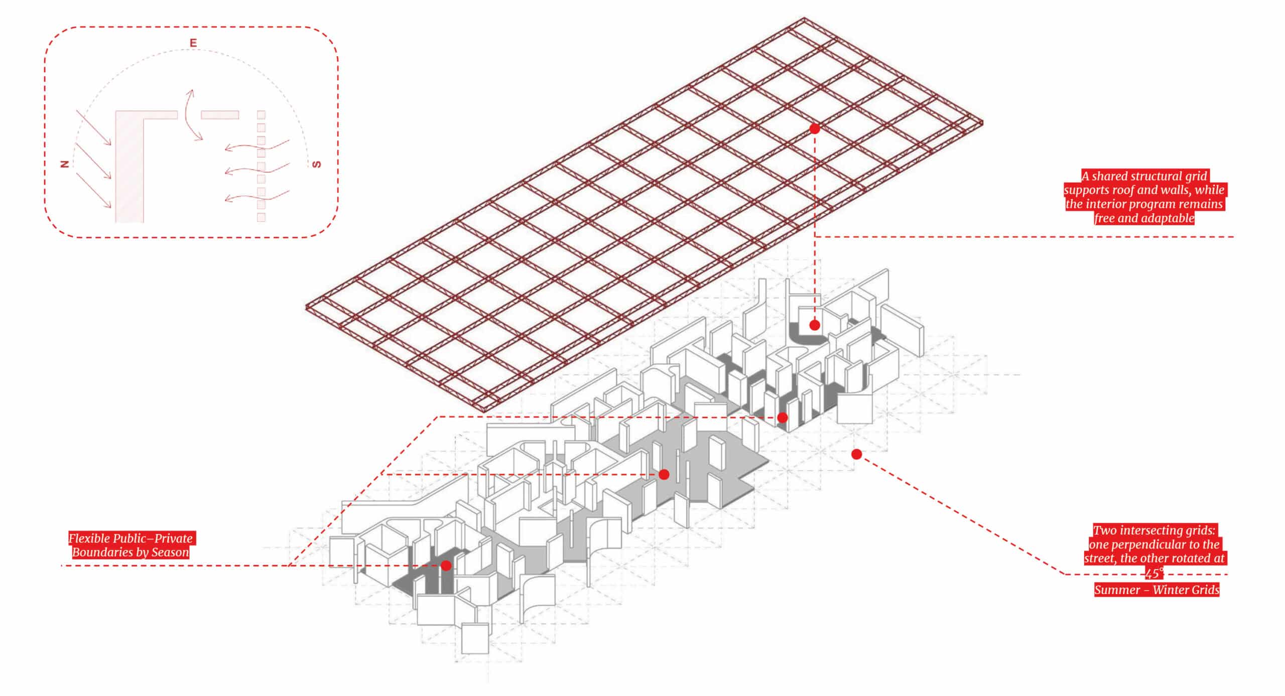 We aimed to create 2 spatial worlds: the roof grid, which acts as an orthogonal and organizing element of the space, and beneath it, the chaos and irregularity of all the spaces that respond to the change in the grid’s direction—allowing for flexible spaces that adapt according to the season. Following climatic strategies and walls positioning, we decided to adopt the principles of traditional masía architecture, where the thicker and more enclosed walls are placed facing the northwest, while the thinner and more permeable ones face the southeast.