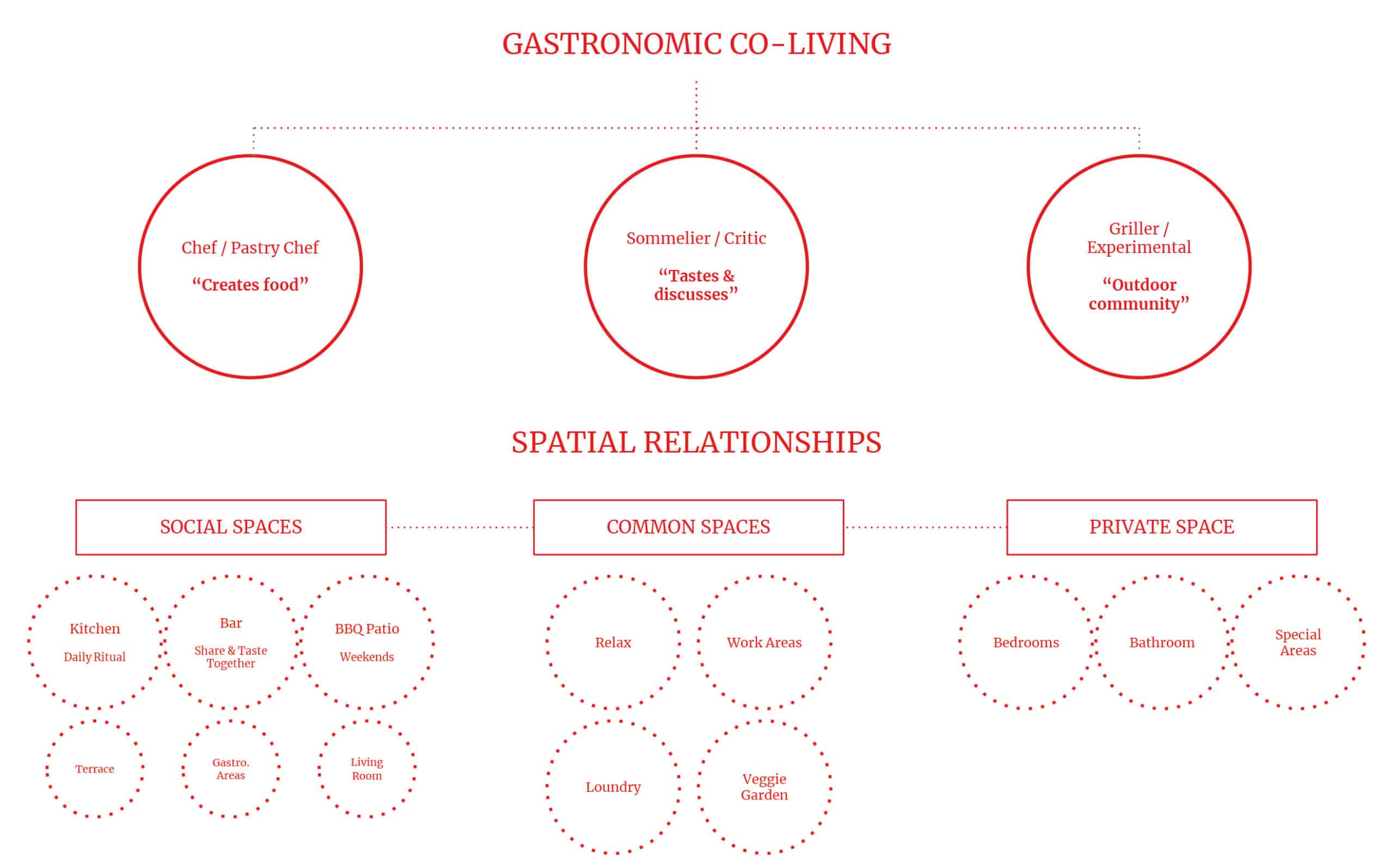 In this co-living, all residents share a common background connected to the world of gastronomy. They include chefs, pastry makers, grill specialists, experimental cooks, critics, and sommeliers. Even though each person has their own routines and creative process, they all value working from home at times and having both comfortable private rooms and shared spaces that support their work. What unites them is their strong relationship with the public areas: cooking together, making outdoor barbecues on weekends, and enjoying a good place to eat, talk, taste, and share ideas. For this reason, the house is organized around a warm and active social core, with private areas branching out to give each resident the right balance between community and personal life.”