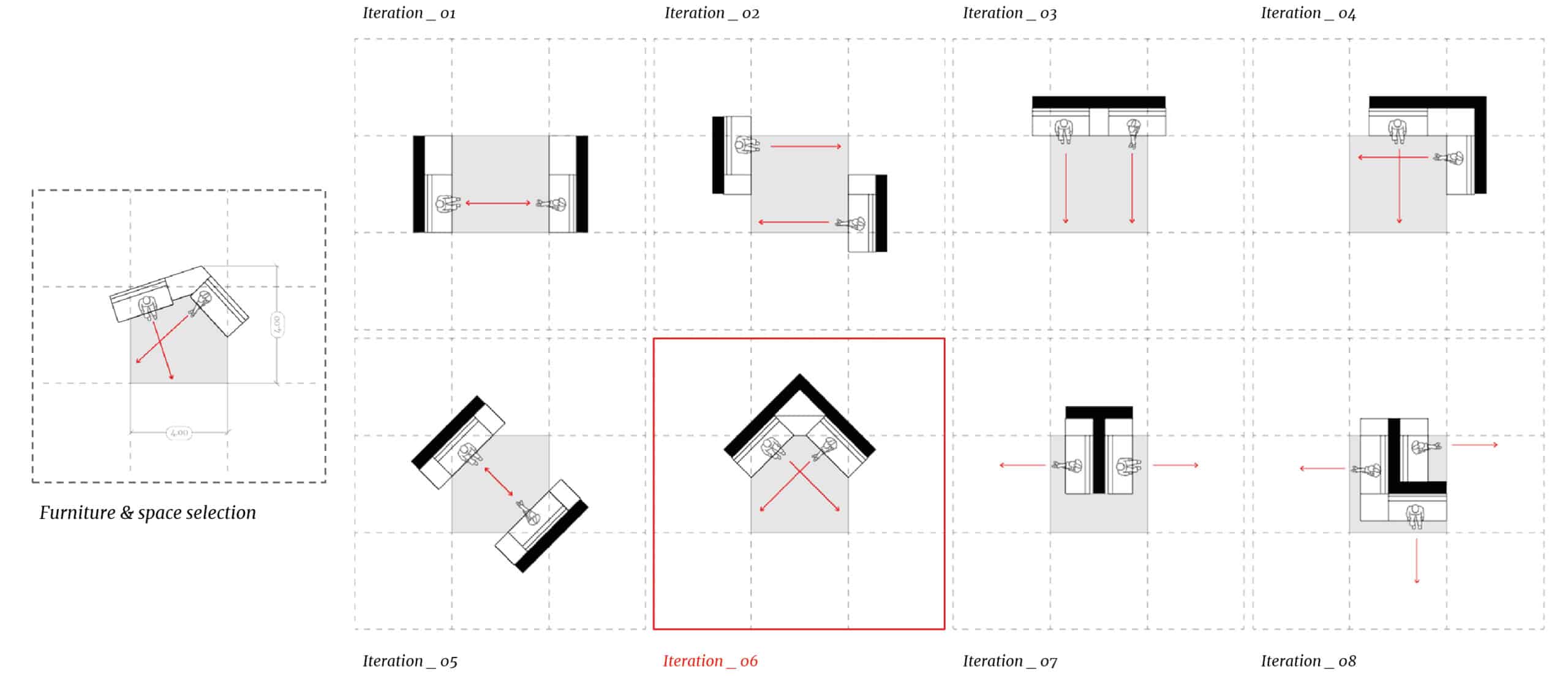 From this we made a catalogue with the idea of body position, view orientation and walls. Each iteration explores how small changes in layout modify the direction of the body and the way space is perceived.