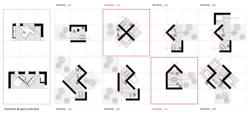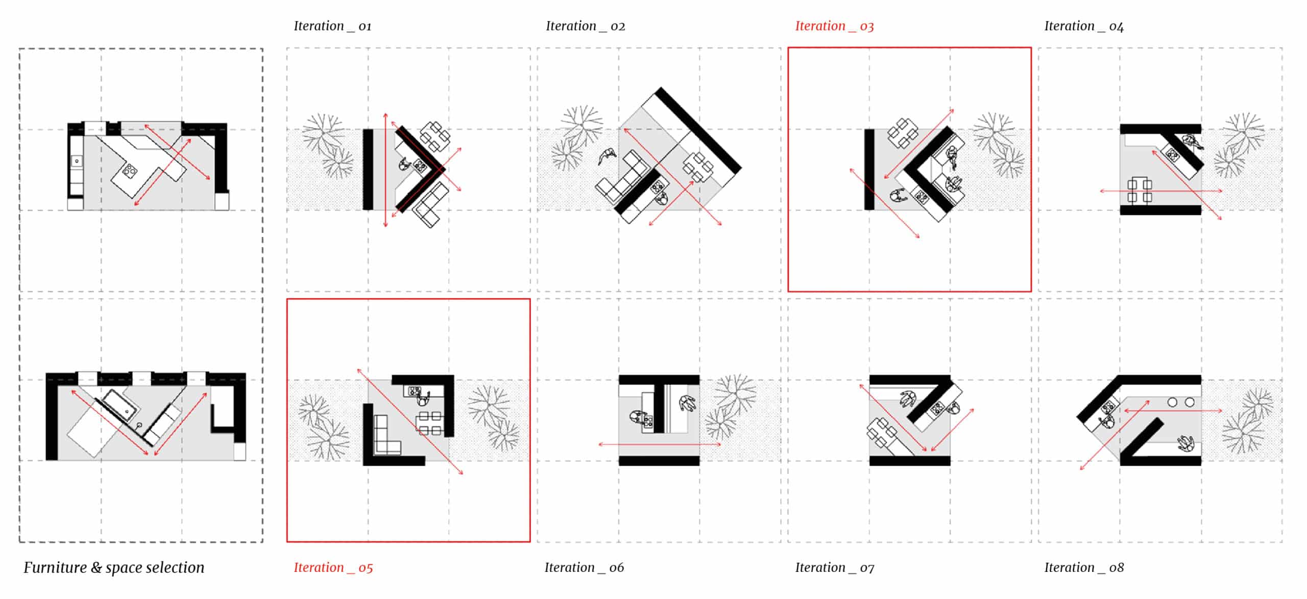Based on this, we explored how changing the orientation of furniture within a rigid grid can break the regularity of the space. The structural grid always remains the same, but with some rotation or shifting the furniture, new spatial conditions appear and These small changes affect how people move,where they look, and how the space is used, generating different atmospheres and ways of occupying the house. This design approach is the one we prioritized throughout the project.