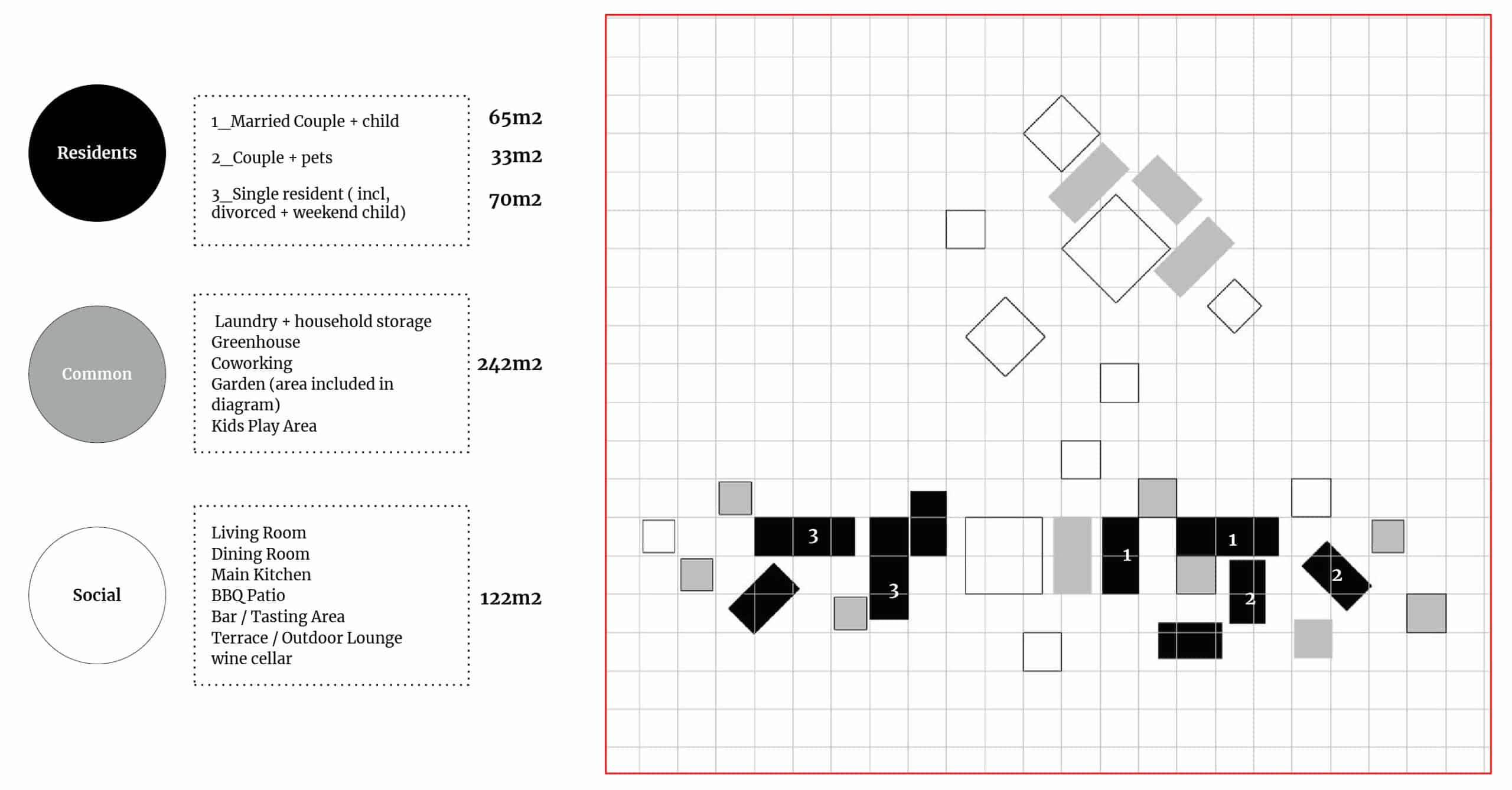 “This co-living brings together four user profiles whose needs and daily rhythms shape the architecture of the project. A married couple with a child requires stability, clear routines, and functional domestic spaces; a young couple with cats needs calm and flexible environments that support living with pets; a divorced resident who receives his child on weekends needs semi-private spaces that can adapt temporarily; and finally, a group of single friends looking for a more dynamic, social lifestyle with strong interaction in the shared areas.