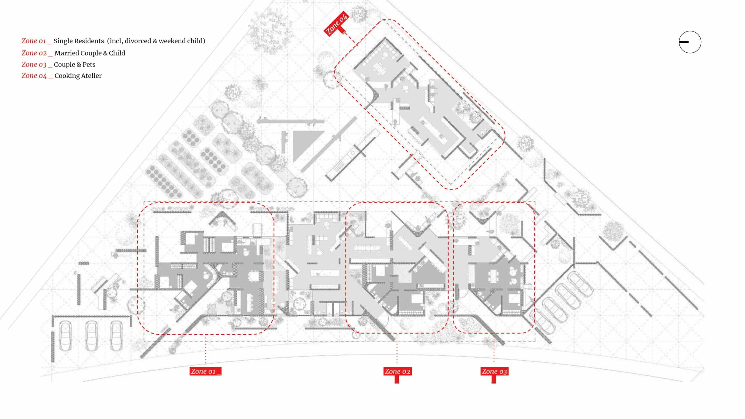 These two volumes are further subdivided into the first three private zones for the different resident groups, and the volume for the common space and cooking workshop experience.