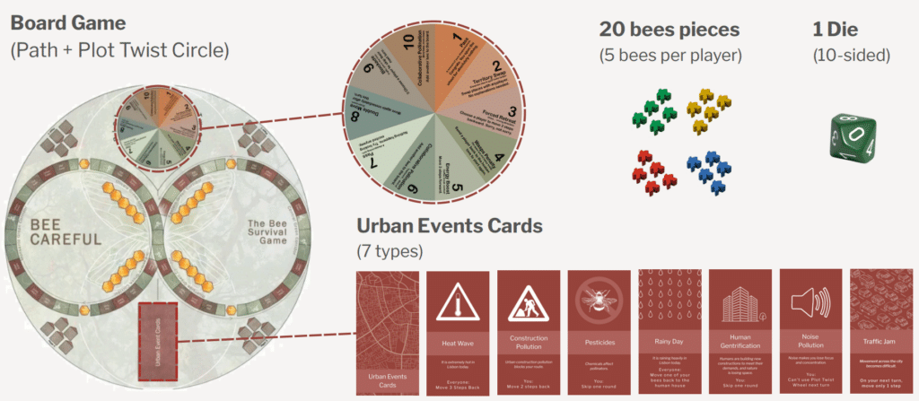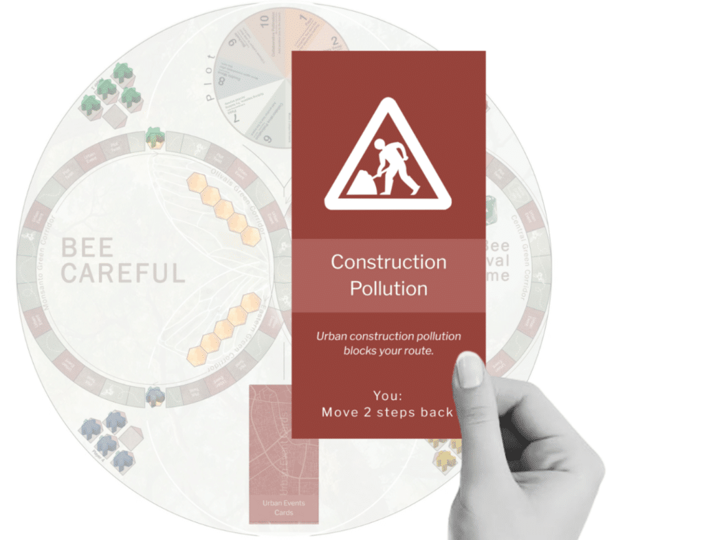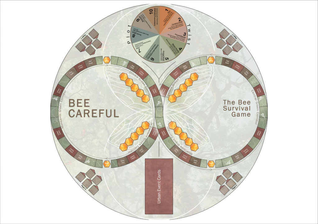 The objective is to help the bees complete the infinity-shaped path across the board and finally reach the natural hives, where they will stay safely.The game combines movement, chance, strategy, and urban environmental events.