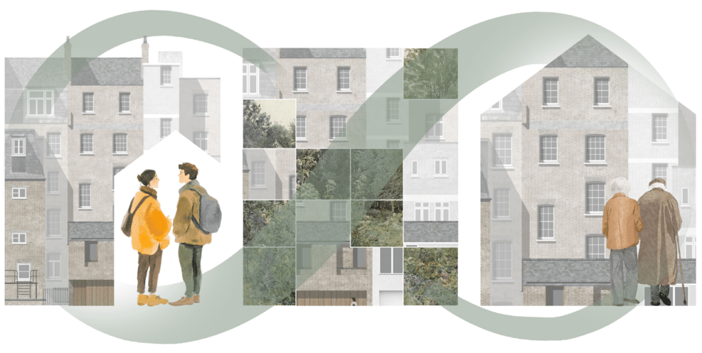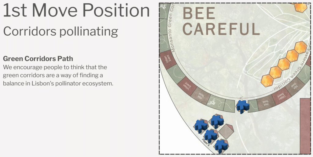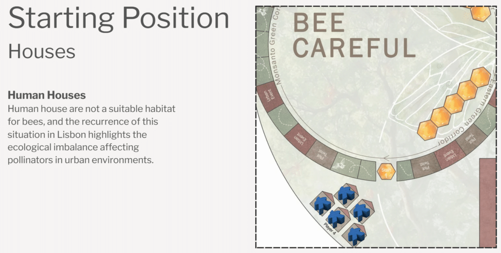 Context – Bee-Careful starts in Lisbon, Portugal. Where social (vulnerable young community), environmental (ecological unbalance and fragmentation), and mobility (elderly retired community) problematics are adressed through one common medium; greenery. Greenery forms the binder in which the previous elderly community of Lisbon convverges with a new and young community across a shared green space, offering the young and vulnerable food and economic stability, and the elderly with leisure and outdooro comfort.