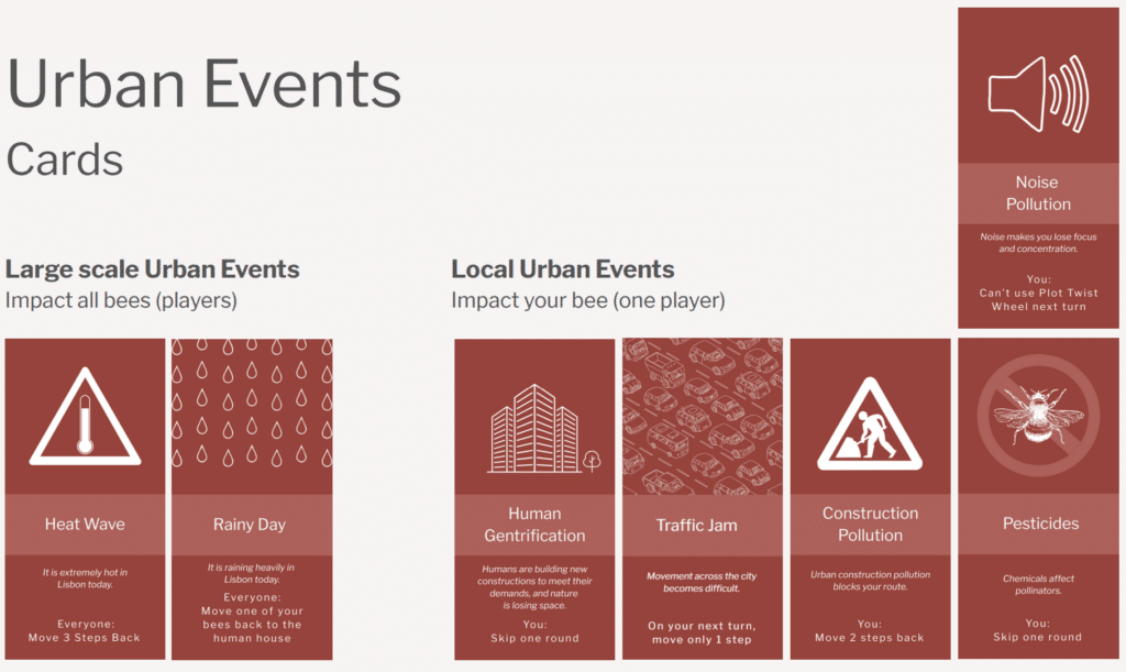 These cards represent environmental conditions in the city that affect bees.