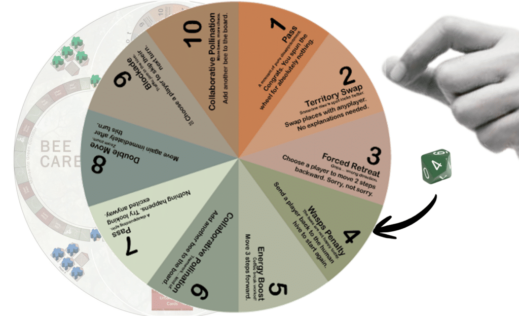 2. Move one bee the number of spaces shown on the dice.