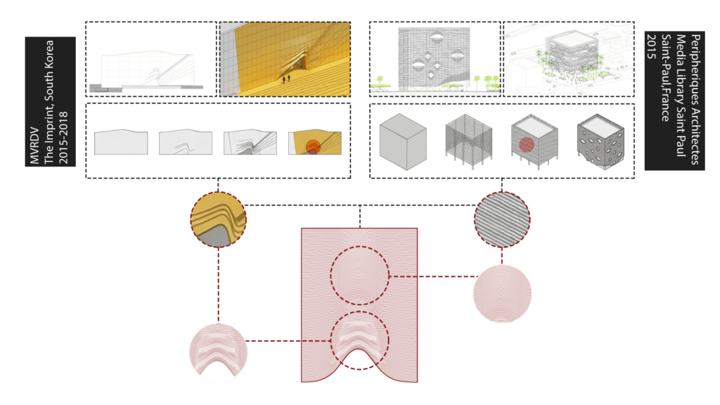 Top-right: Media Library Saint-Paul, Réunion, Périphériques Architectes, 2015 – photograph and axonometric adapted from ArchDaily; analytical diagrams redrawn by the author using Nano Banana Pro.