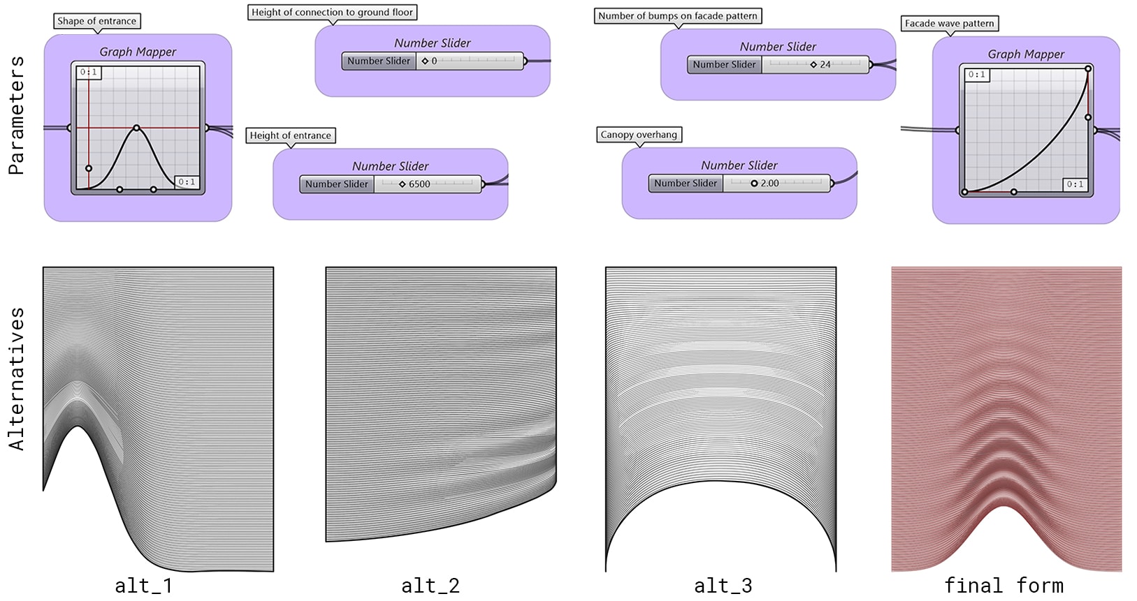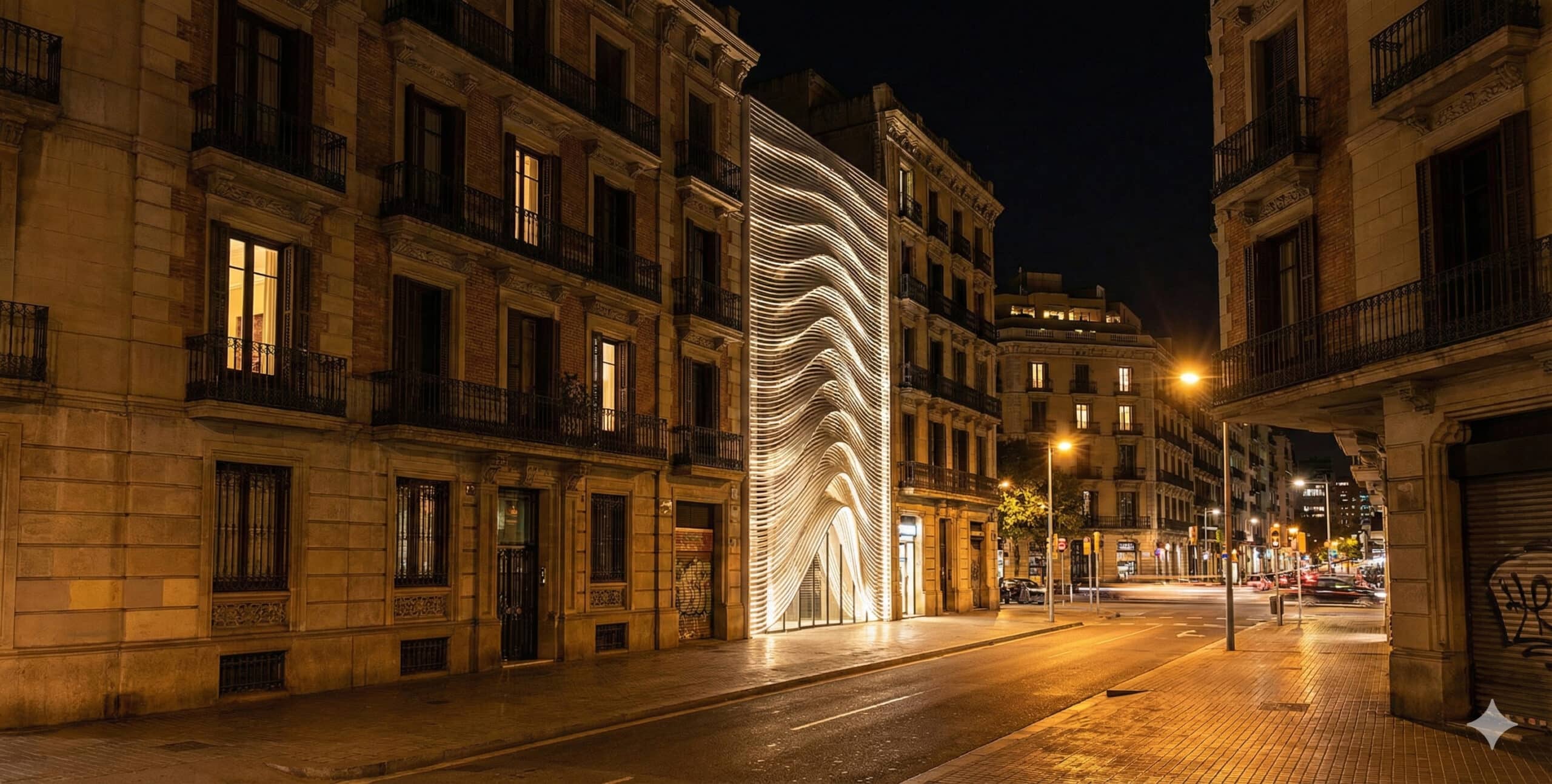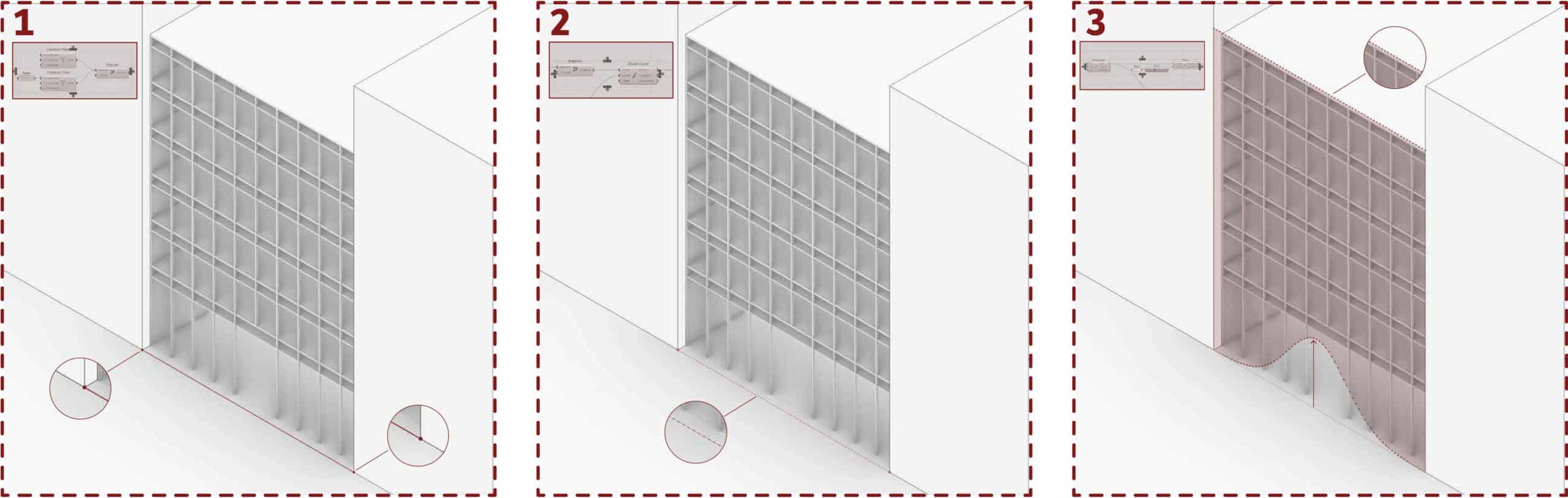 This assignment aims to investigate how architecture and technology overlap by designing a façade that includes at least one entrance opening using computational methods. We engaged through the full design workflow, from initial concept to final outcome, using digital tools and algorithms to produce innovative, dynamic forms on chosen building fronts within a specific Barcelona city block, and to communicate the form-finding logic through sets of diagrams and animations.