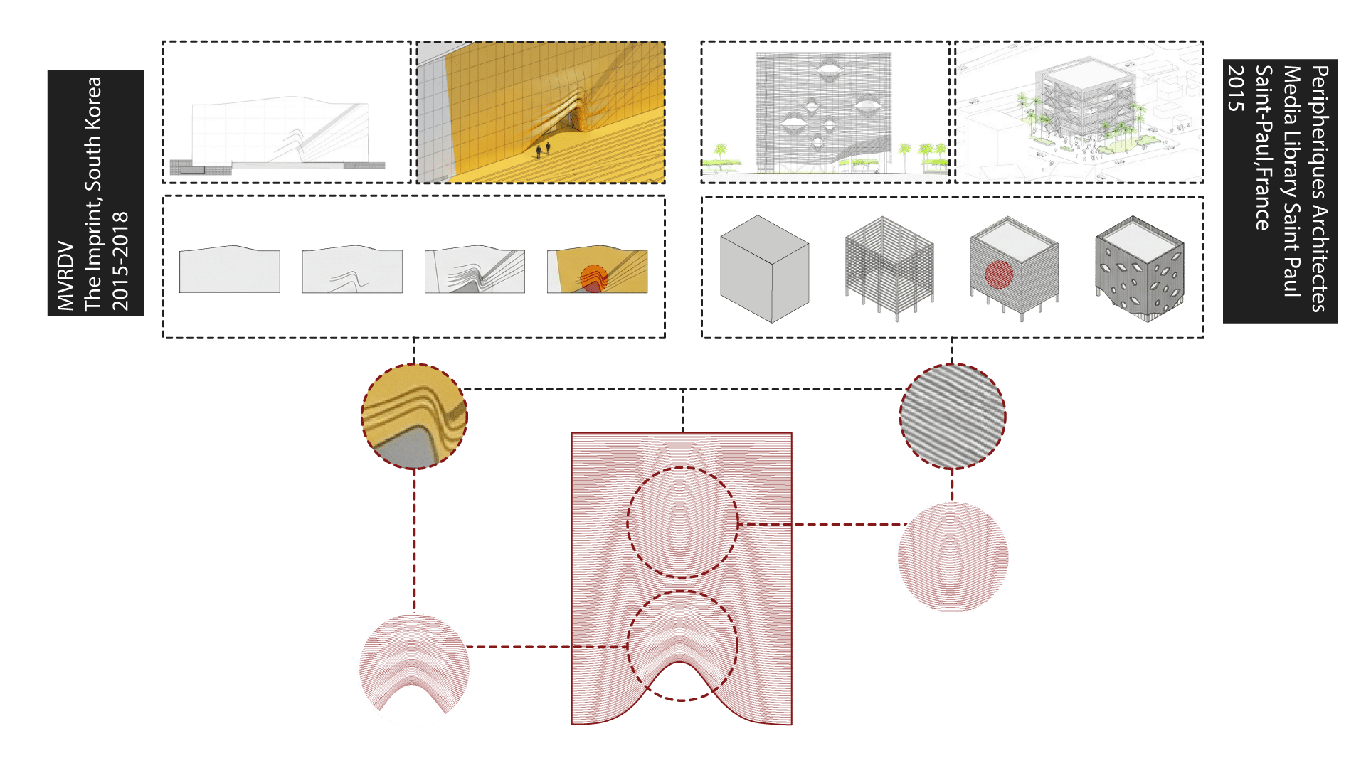 Bottom: author’s parametric façade diagrams for the Barcelona retail project, developed from the two precedents.