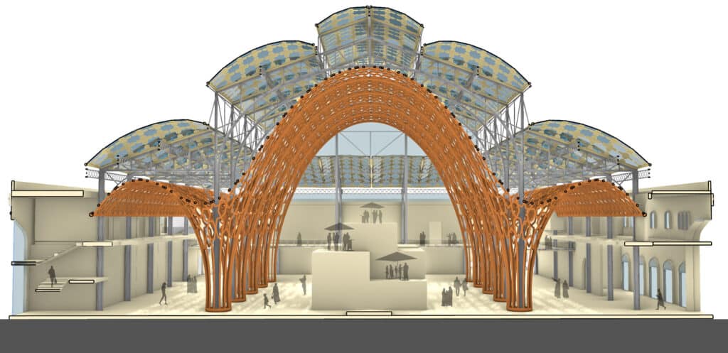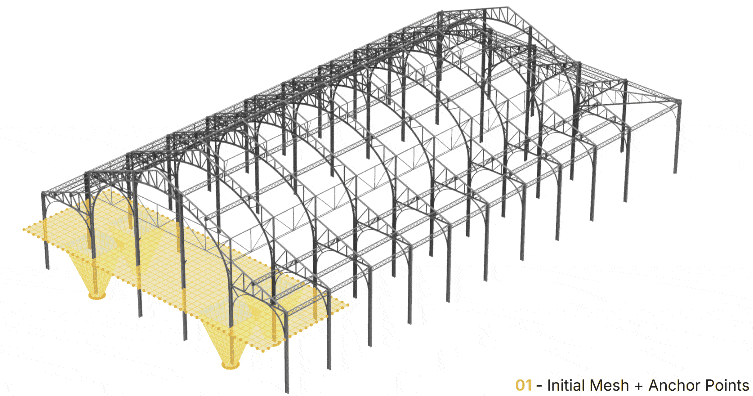 The interior shell starts from an initial mesh and anchor points. Through dynamic relaxation, a funicular form is obtained -organic, resilient, and adaptable. This form is repeated across the market. Different curvatures emerged by changing the size of the initial mesh and the load factor applied.