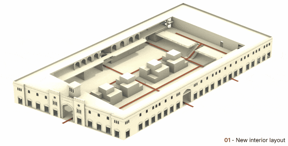 The layout begins with a new exhibition space, conceived as a cultural anchor within the market. Circulation paths connect the main entrances with an elevated area, weaving together flows of visitors and merchants. Multi-level stores are organised along the central axis, creating a vibrant spine of activity.