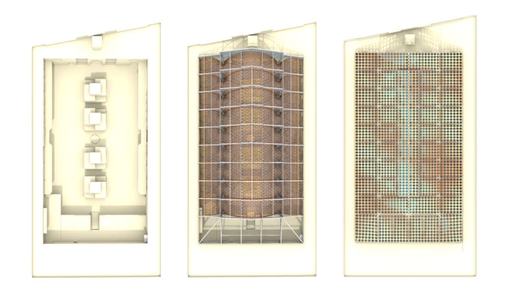 • Patterns applied to the vaults, creating a dynamic surface language that shifts with perspective and light.