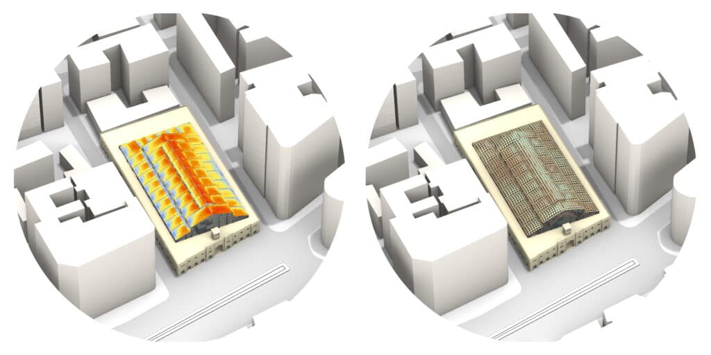 For the exterior roof, he solar irradiance analysis informed the grouping of panels panels into three types:
