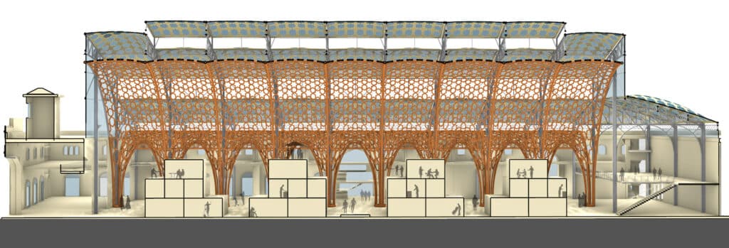 The strategy was to leave the existing market mostly untouched, except for the roof panels. This approach preserves the integrity of the original steel framework while introducing a new architectural language that overlays, complements, and revitalizes the space.