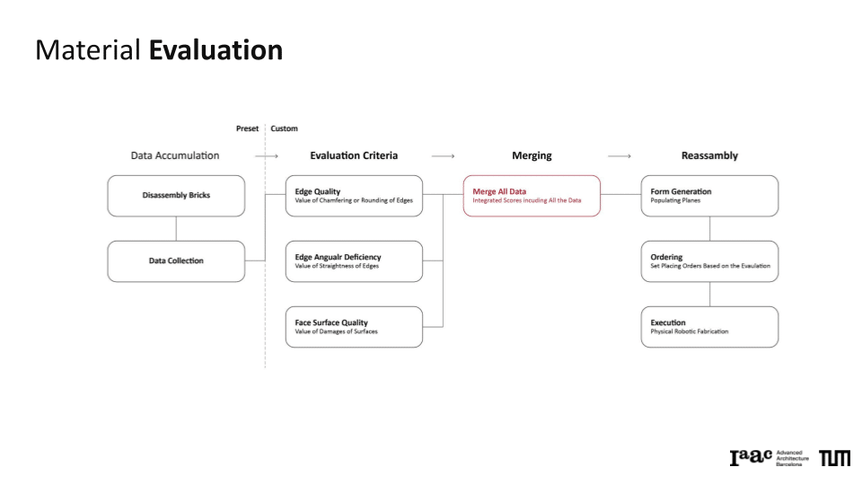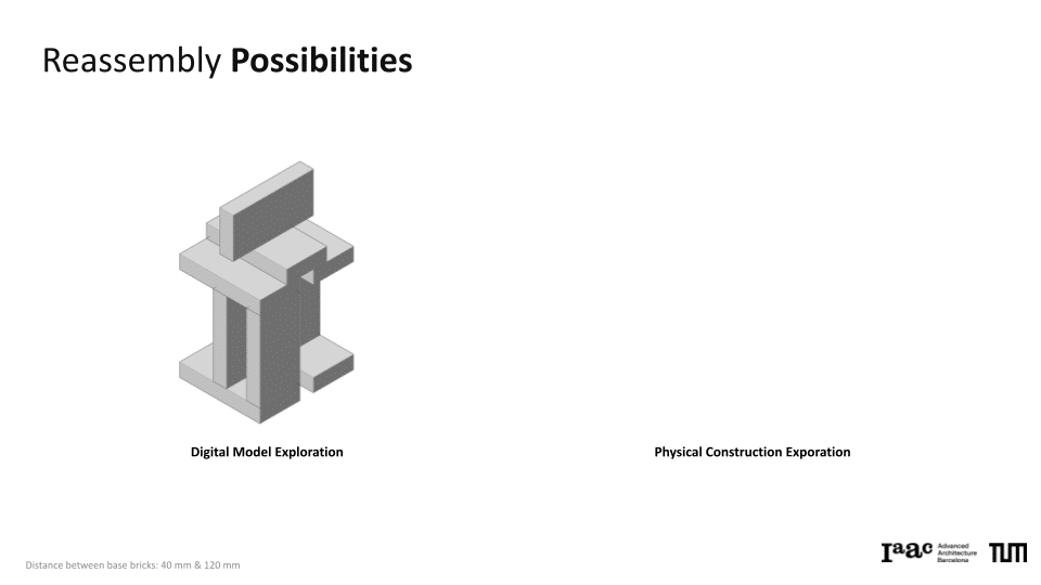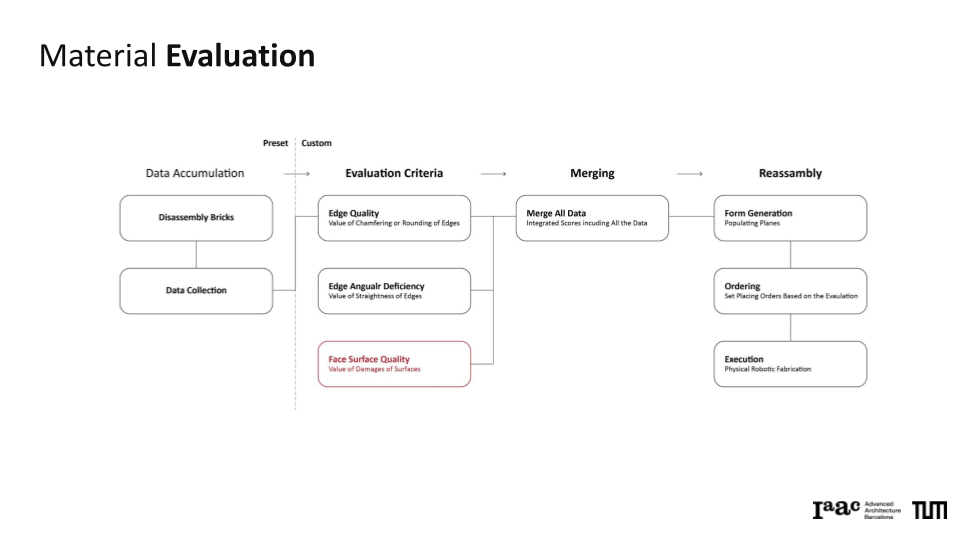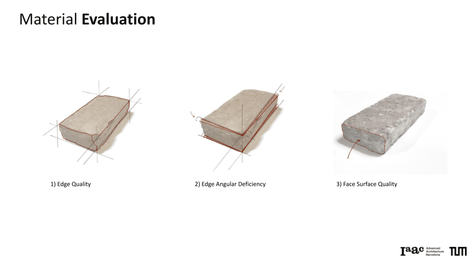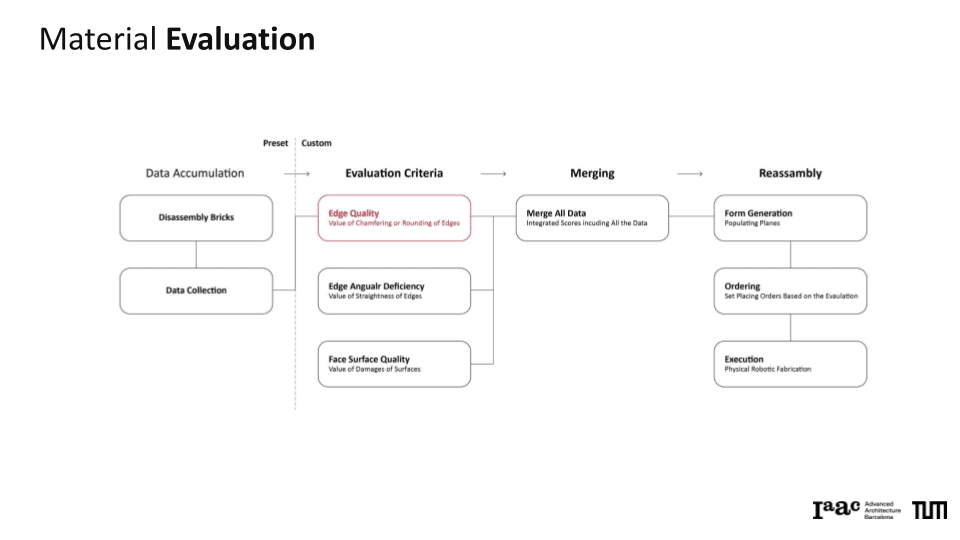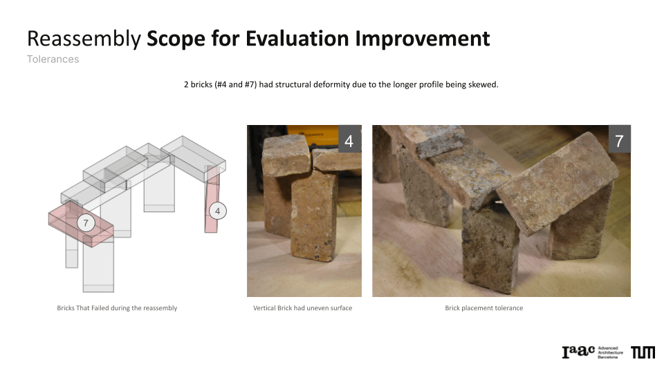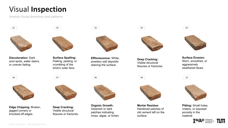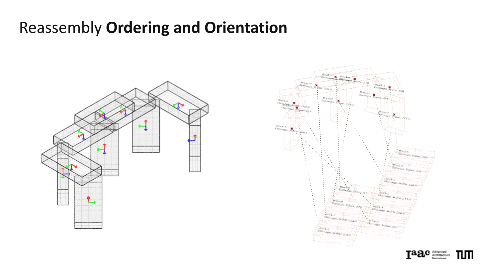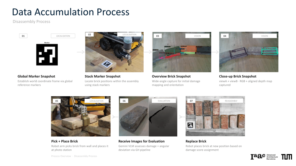 The project explores a circular construction workflow that integrates robotic systems with Spatial AI to automate the disassembly and reassembly of brick structures. Utilizing a Gemini Vision-Language Model (VLM) pipeline, the system performs autonomous material evaluation, identifying surface damages such as chipping, spalling, and staining, as well as structural angular deficiencies in individual bricks. This data is merged into an integrated scoring system that dictates the ordering and precise robotic execution of a new assembly. By bridging digital design exploration with physical construction, the work demonstrates how AI-driven vision can manage material uncertainties to recreate complex forms, such as a stonehenge-inspired vault structure.