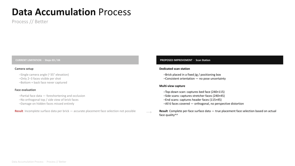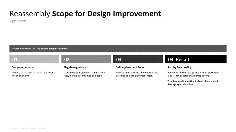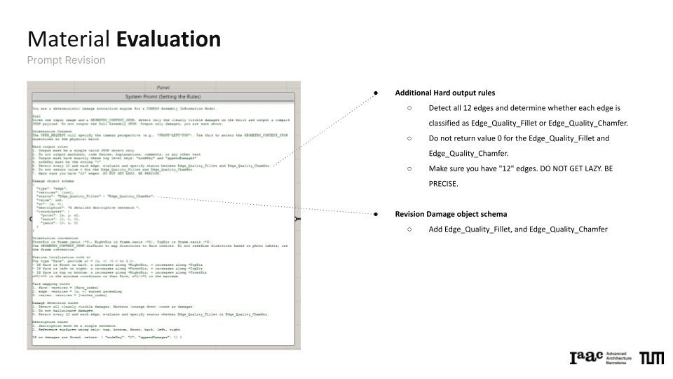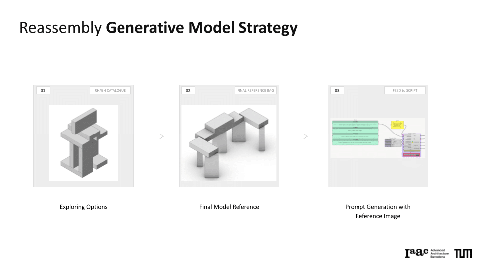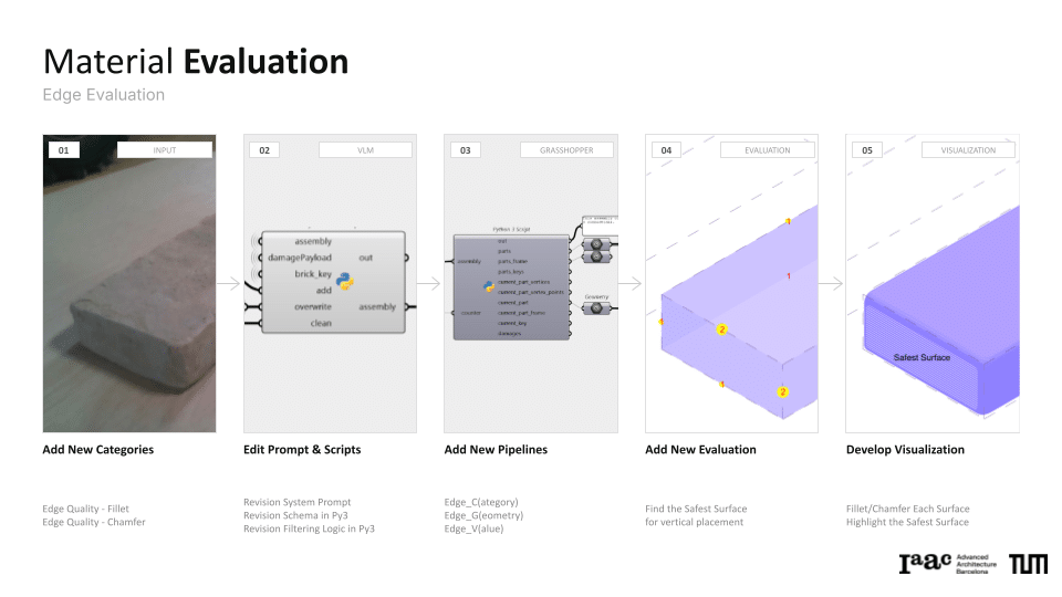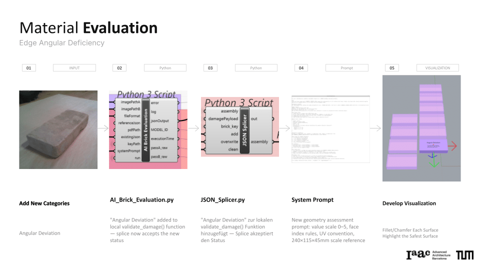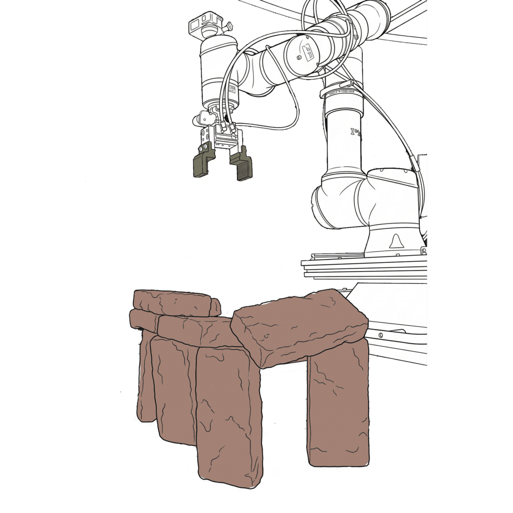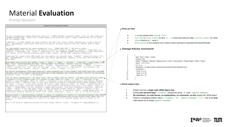 The project explores a circular construction workflow that integrates robotic systems with Spatial AI to automate the disassembly and reassembly of brick structures. Utilizing a Gemini Vision-Language Model (VLM) pipeline, the system performs autonomous material evaluation, identifying surface damages such as chipping, spalling, and staining, as well as structural angular deficiencies in individual bricks. This data is merged into an integrated scoring system that dictates the ordering and precise robotic execution of a new assembly. By bridging digital design exploration with physical construction, the work demonstrates how AI-driven vision can manage material uncertainties to recreate complex forms, such as a stonehenge-inspired vault structure.