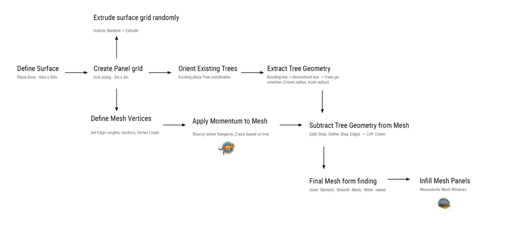 Key parameters include plaza dimensions, grid resolution, tree coordinates, mesh relaxation forces, and structural logic—making the system adaptable and repeatable.