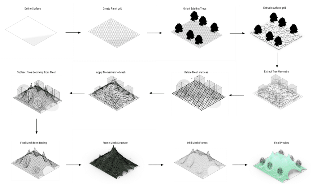 surface definition → grid subdivision → tree constraints → mesh deformation → form-finding → structural framing → final geometry.