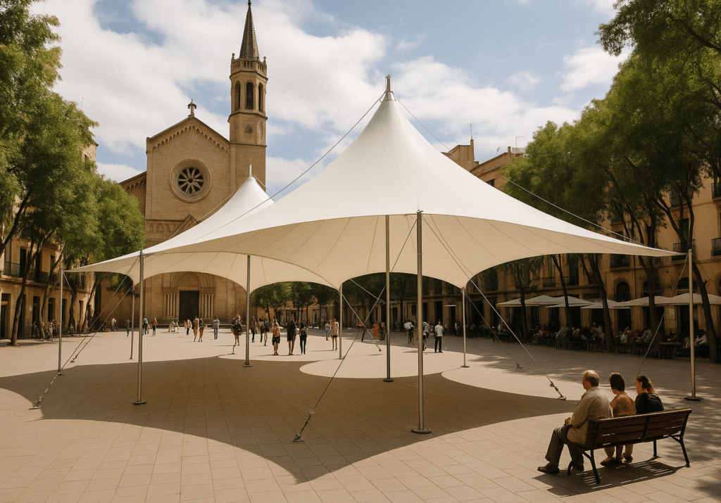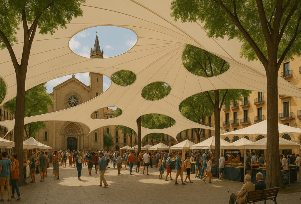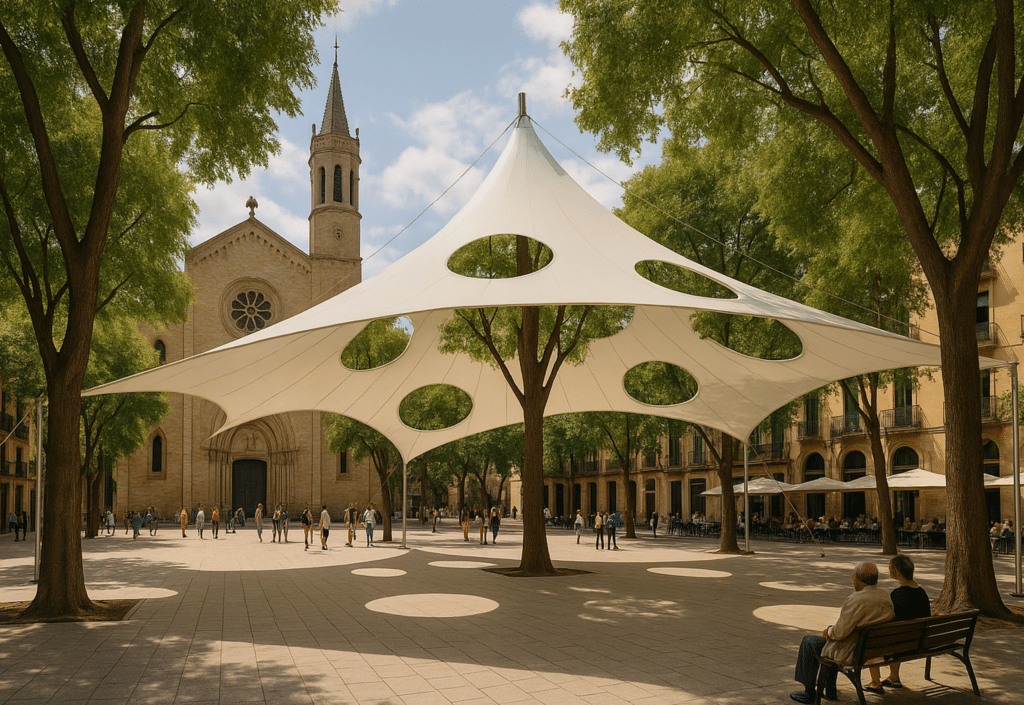 Canopy Dialogue introduces a temporary pavilion designed through computational form-finding, responding directly to the existing trees and social life of Plaça de la Virreina.
