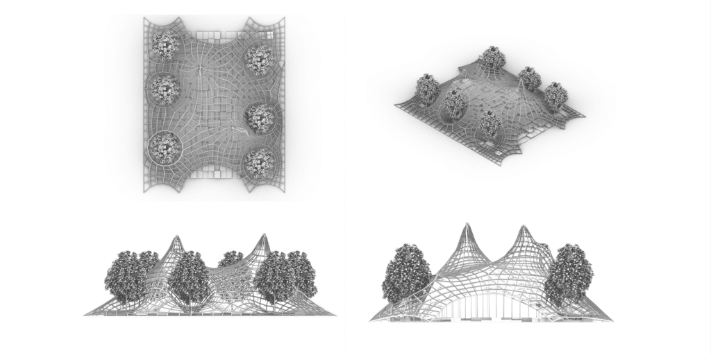 The canopy expanded beyond the center, wrapping across the plaza and engaging multiple tree clusters to create a porous, continuous surface.
