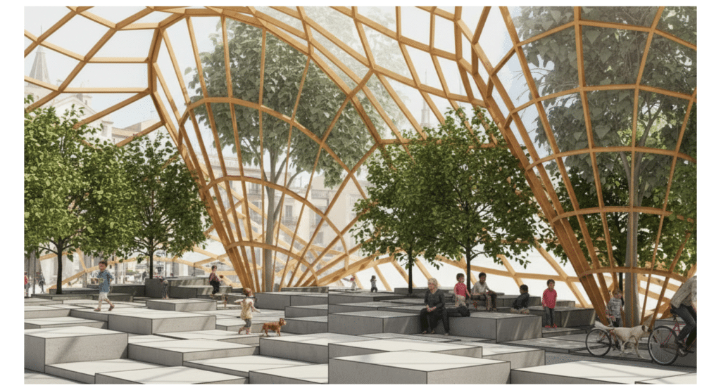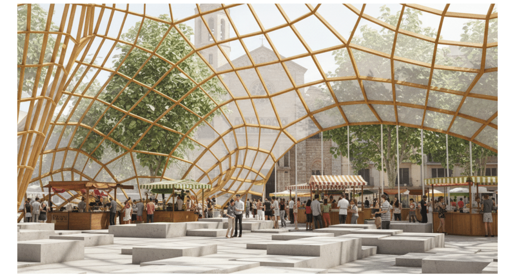 The pavilion becomes an active social canopy filtering light, framing market activity, and integrating seamlessly with the plaza.